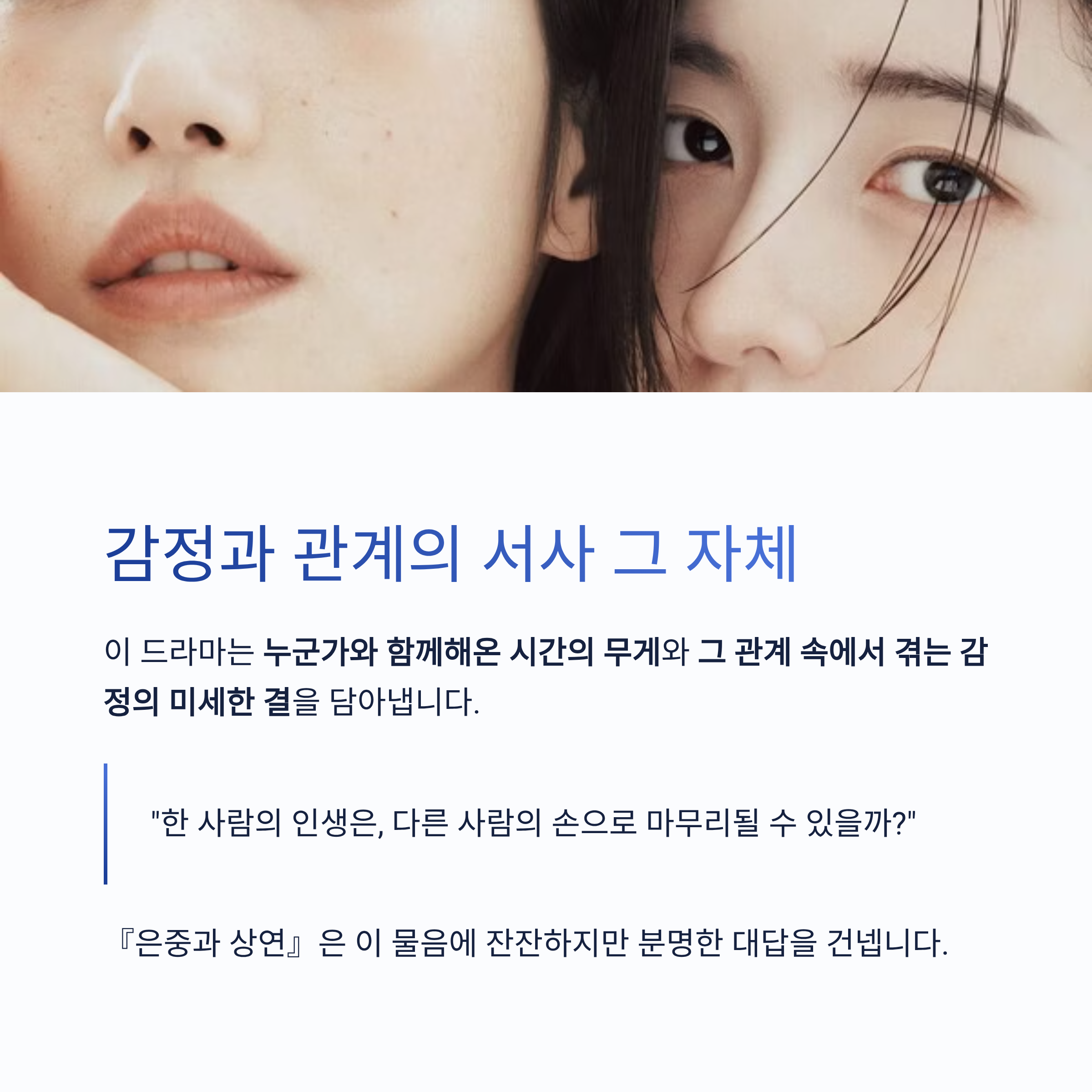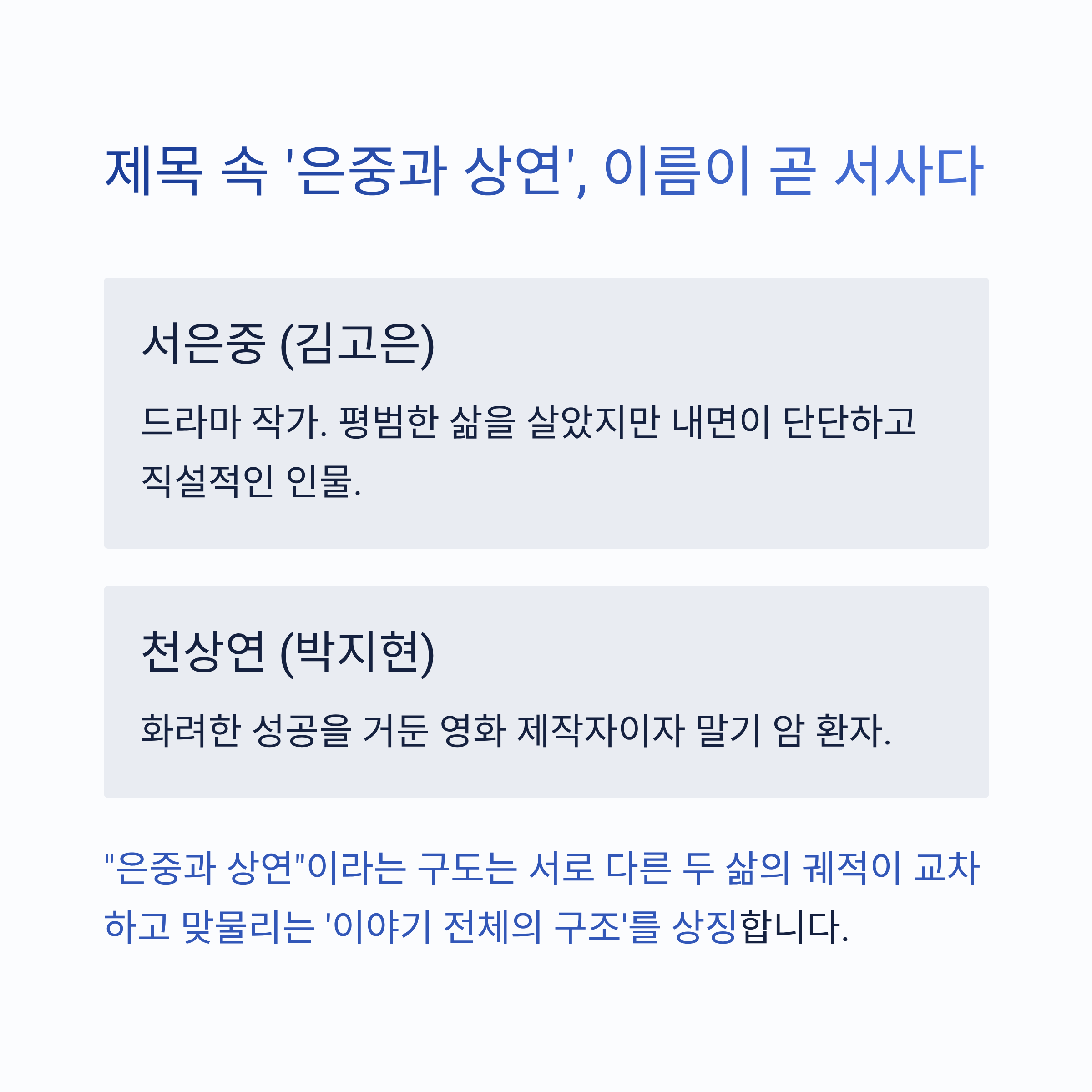 "은중과 상연"이라는 구도는 곧, 서로 다른 두 삶의 궤적이 교차하고 맞물리는 ‘이야기 전체의 구조’를 상징합니다.
