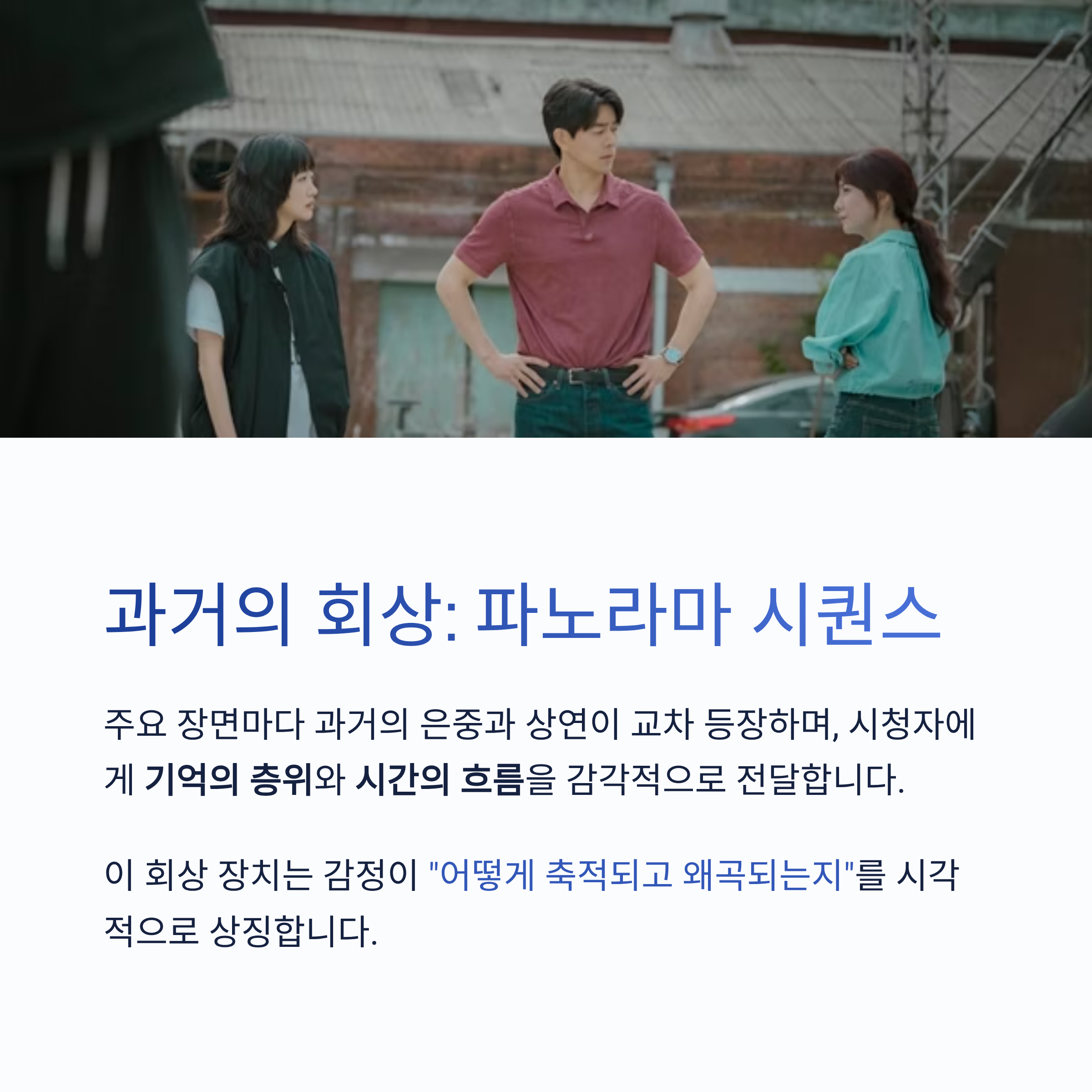 시청자에게 기억의 층위와 시간의 흐름을 감각적으로 전달합니다.