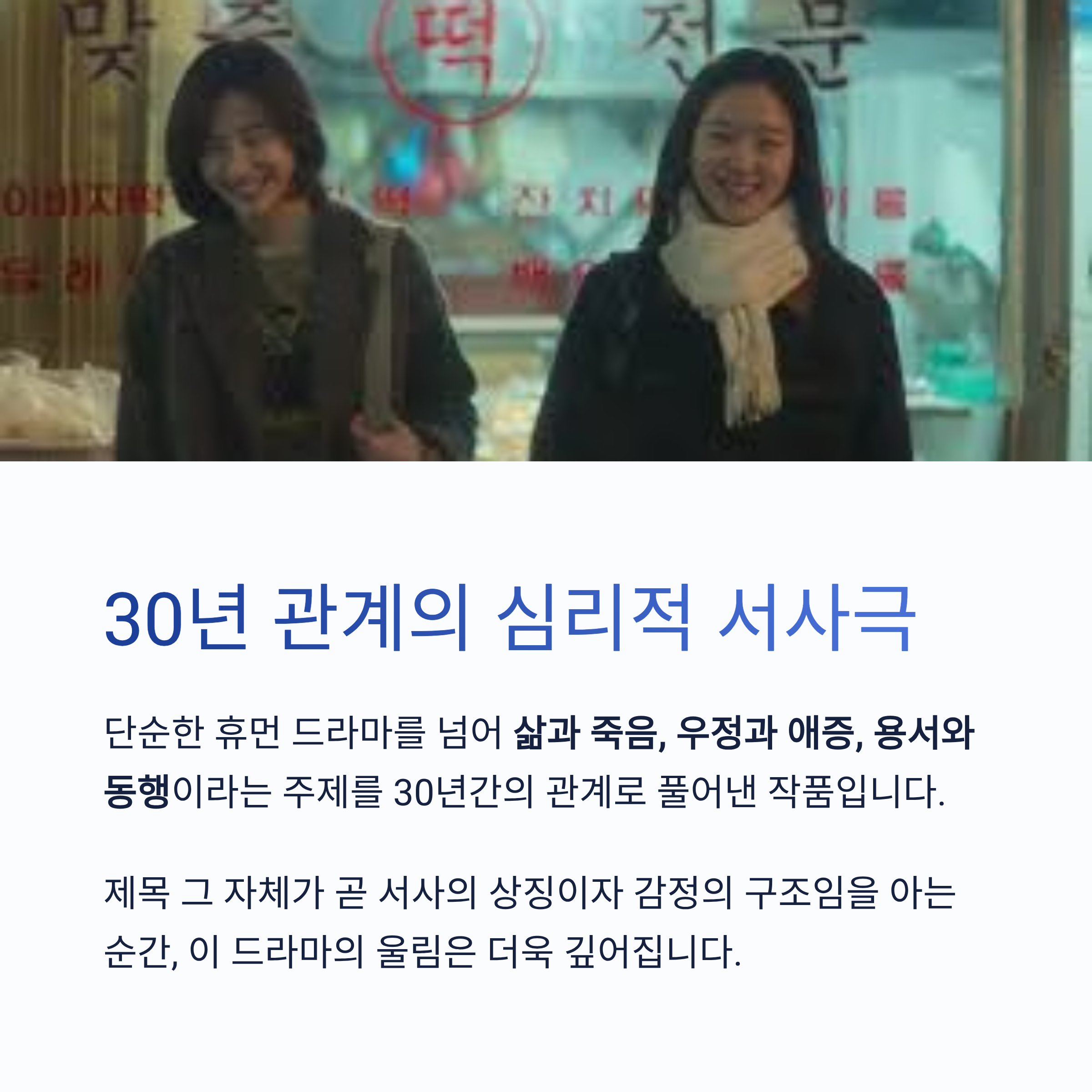 이 드라마는 누군가와 함께해온 시간의 무게와 그 관계 속에서 겪는 감정의 미세한 결을 담아냅니다.