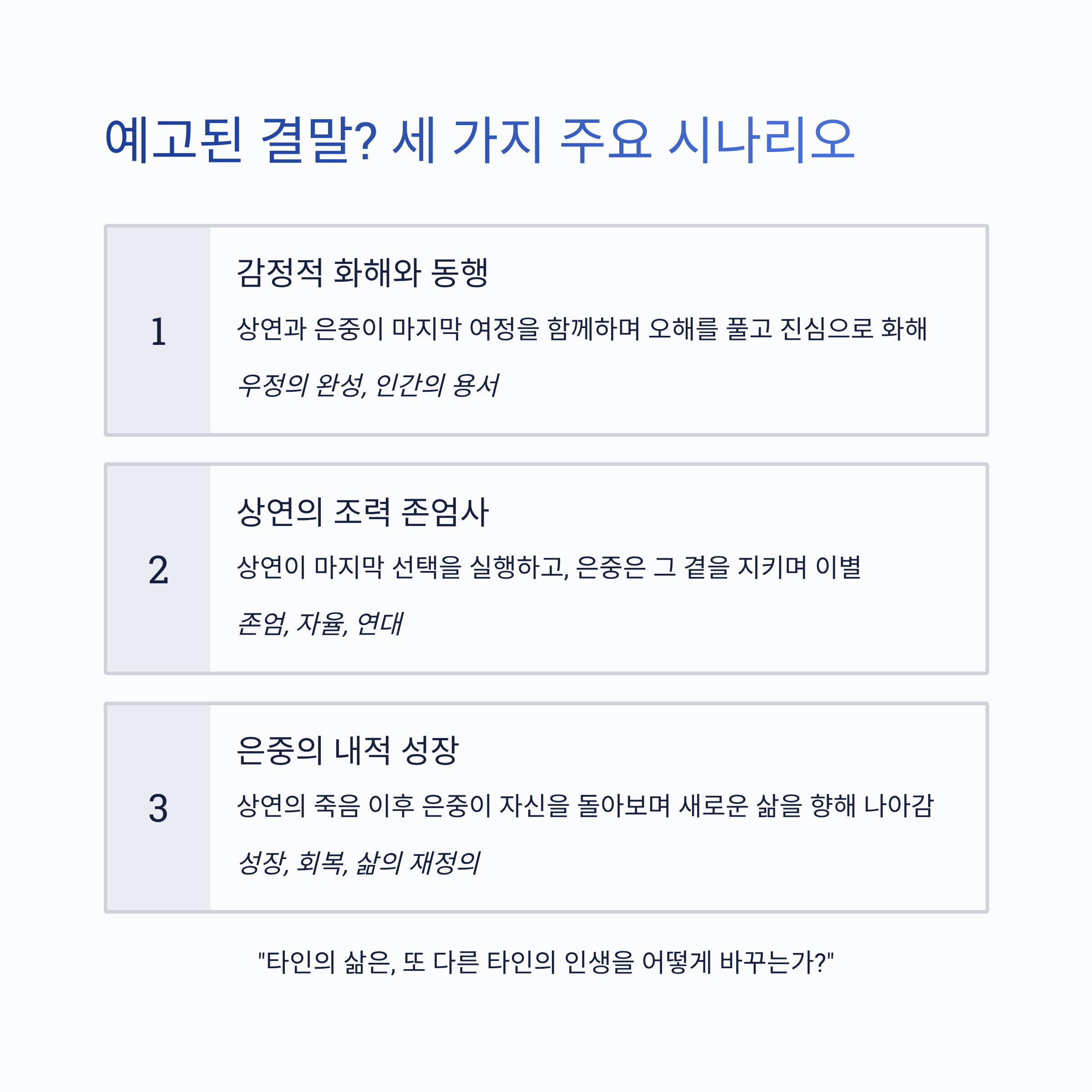 | 1. 감정적 화해와 동행 | 상연과 은중이 마지막 여정을 함께하며 오해를 풀고 진심으로 화해 | 우정의 완성, 인간의 용서 |