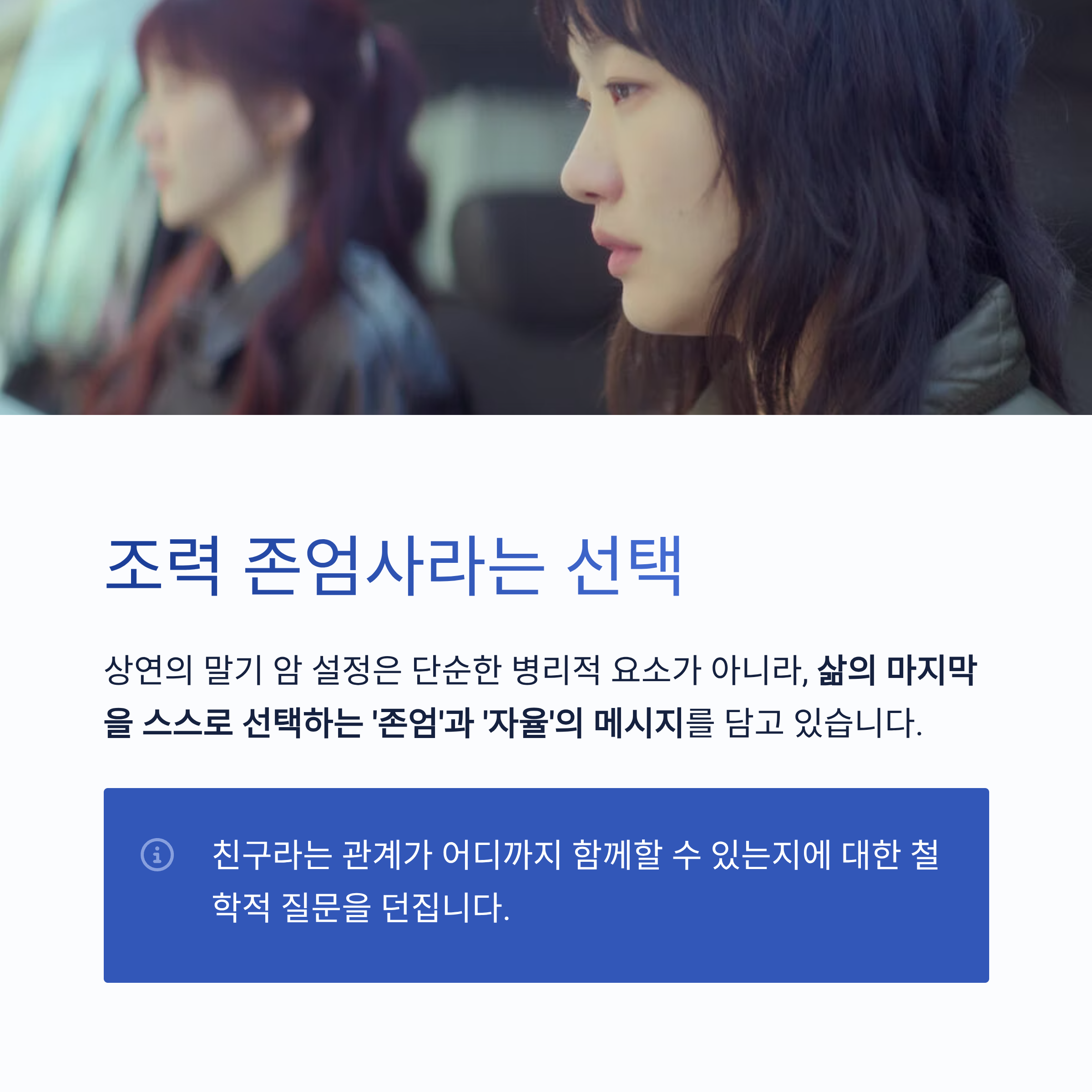 삶의 마지막을 스스로 선택하는 ‘존엄’과 ‘자율’의 메시지를 담고 있습니다.