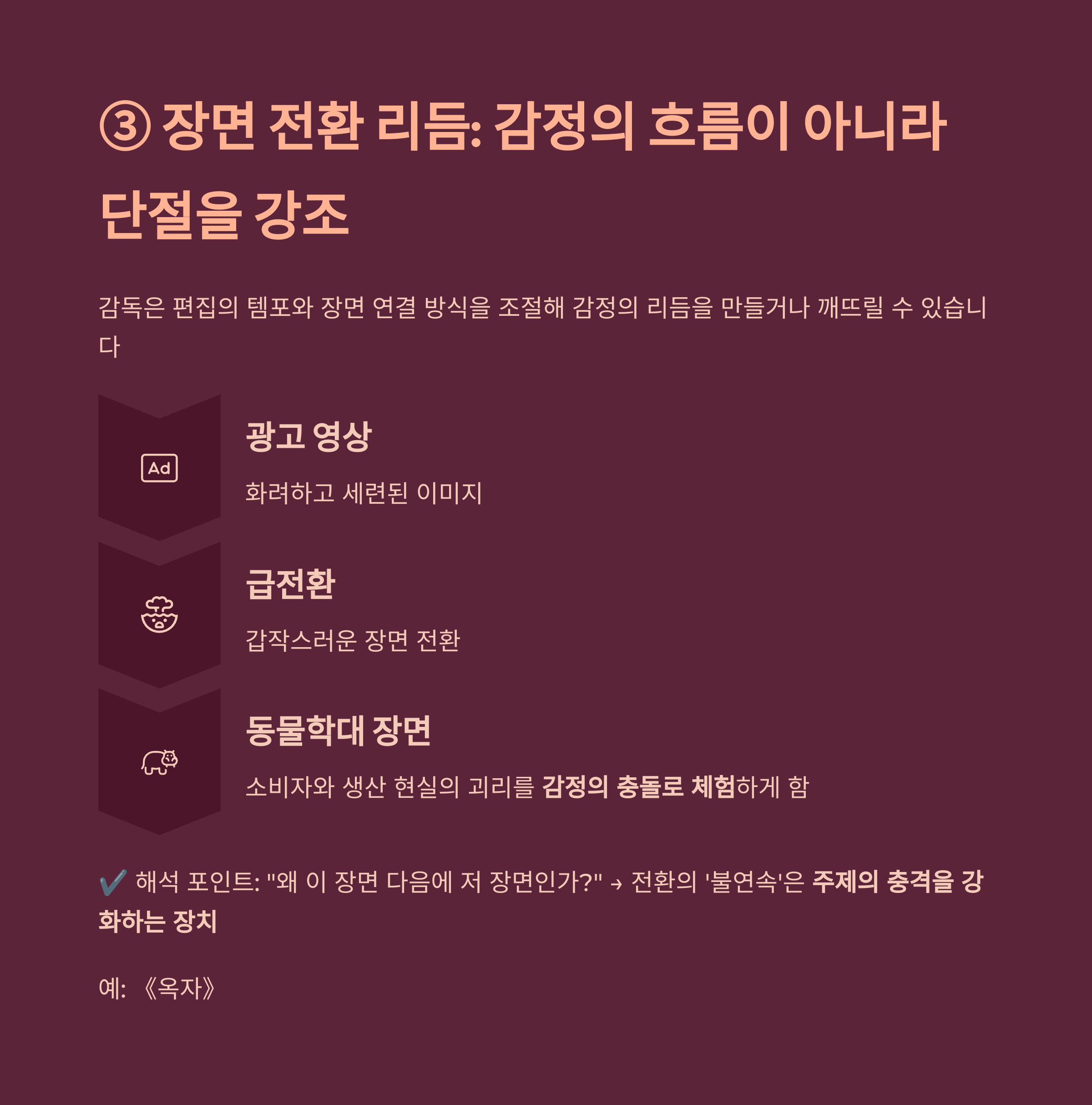 ③ 장면 전환 리듬: 감정의 흐름이 아니라 단절을 강조