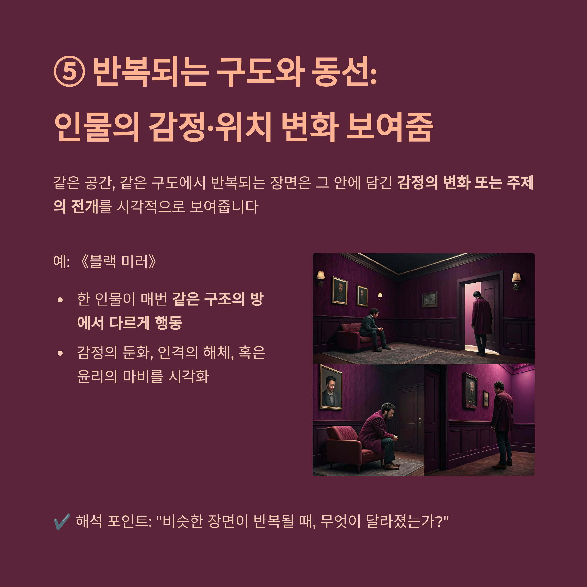 ⑤ 반복되는 구도와 동선: 인물의 감정·위치 변화 보여줌