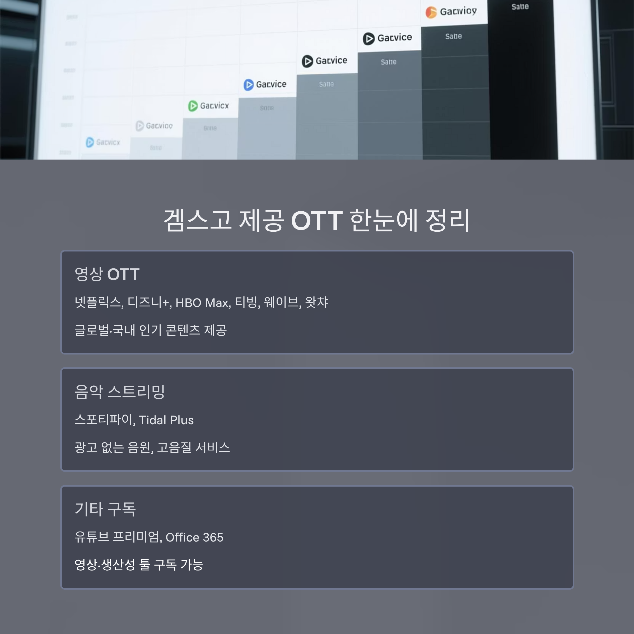 | 영상 OTT | 넷플릭스, 디즈니+, HBO Max, 티빙, 웨이브, 왓챠 | 글로벌·국내 인기 콘텐츠 제공 |