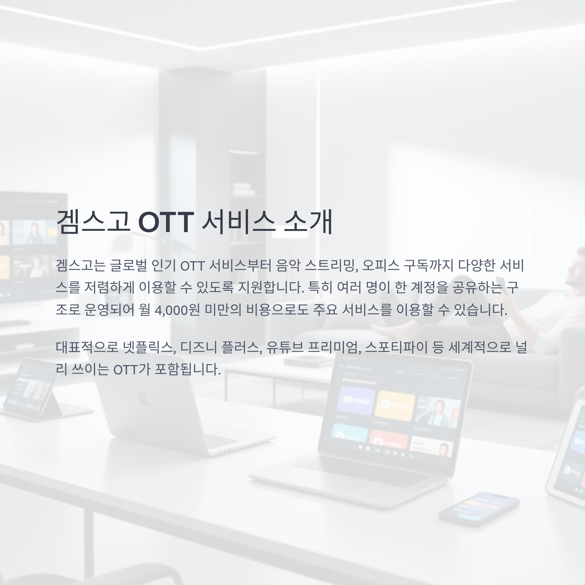 겜스고는 글로벌 인기 OTT 서비스부터 음악 스트리밍, 오피스 구독까지 다양한 서비스를 저렴하게 이용할 수 있도록 지원합니다. 특히 여러 명이 한 계정을 공유하는 구조로 운영되어 월 4,000원 미만의 비용으로도 주요 서비스를 이용할 수 있습니다. 대표적으로 넷플릭스, 디즈니 플러스, 유튜브 프리미엄, 스포티파이 등 세계적으로 널리 쓰이는 OTT가 포함됩니다.