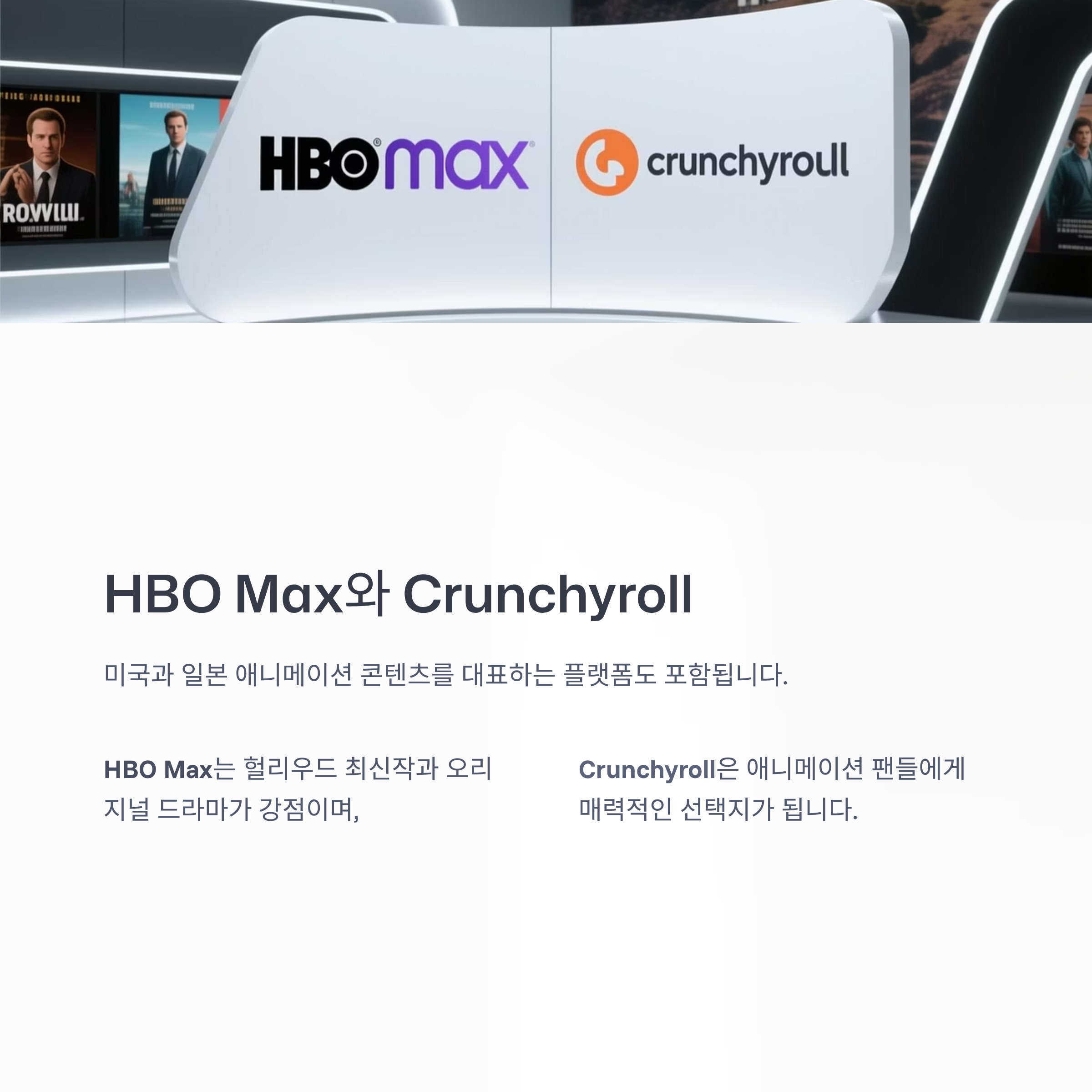 미국과 일본 애니메이션 콘텐츠를 대표하는 플랫폼도 포함됩니다. HBO Max는 헐리우드 최신작과 오리지널 드라마가 강점이며, Crunchyroll은 애니메이션 팬들에게 매력적인 선택지가 됩니다.