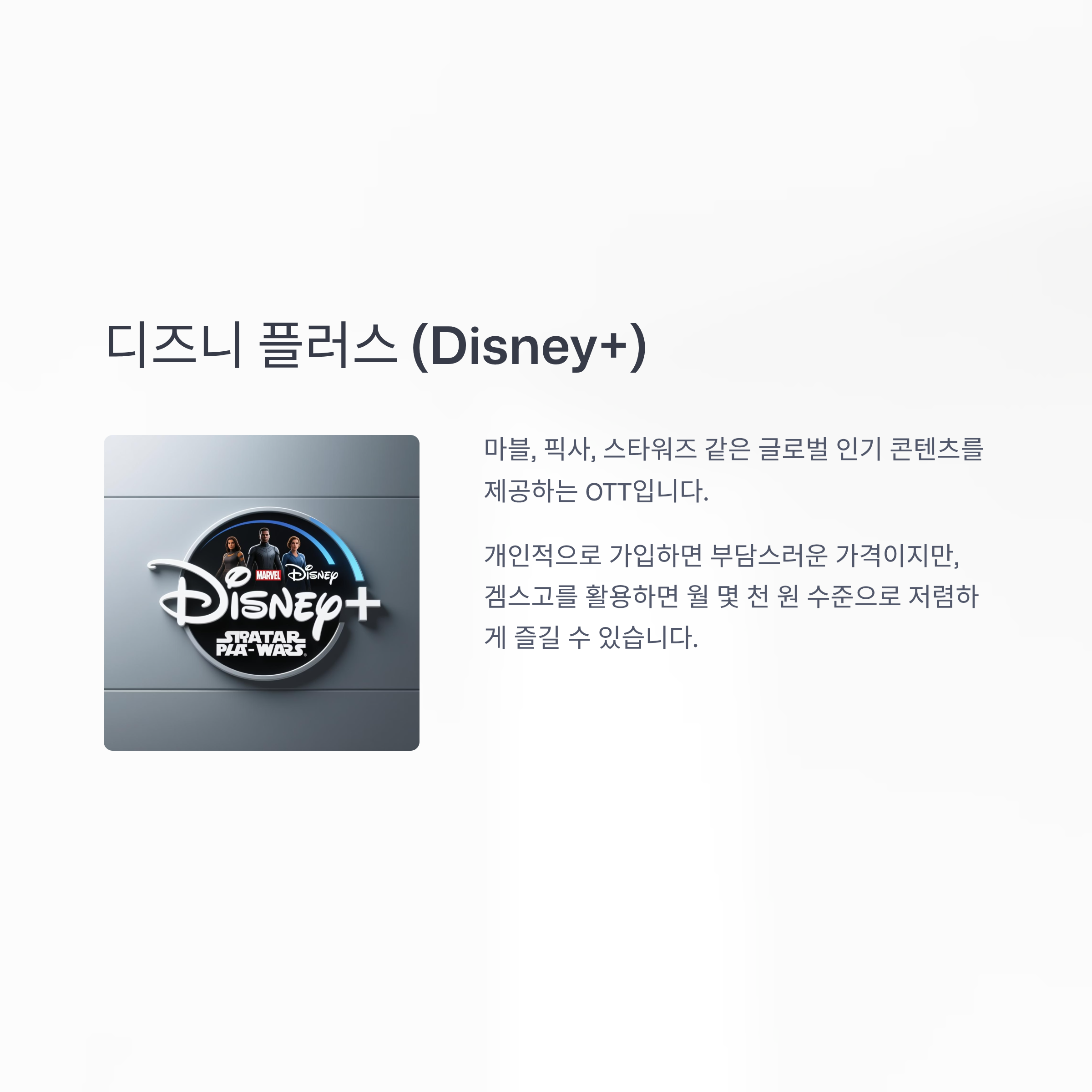 마블, 픽사, 스타워즈 같은 글로벌 인기 콘텐츠를 제공하는 OTT입니다. 개인적으로 가입하면 부담스러운 가격이지만, 겜스고를 활용하면 월 몇 천 원 수준으로 저렴하게 즐길 수 있습니다.