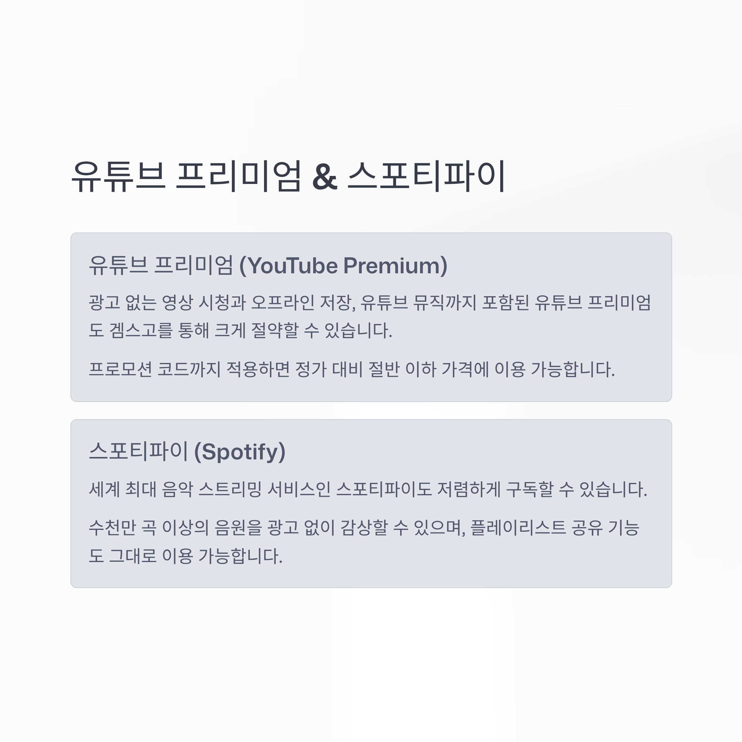 광고 없는 영상 시청과 오프라인 저장, 유튜브 뮤직까지 포함된 유튜브 프리미엄도 겜스고를 통해 크게 절약할 수 있습니다. 프로모션 코드까지 적용하면 정가 대비 절반 이하 가격에 이용 가능합니다.