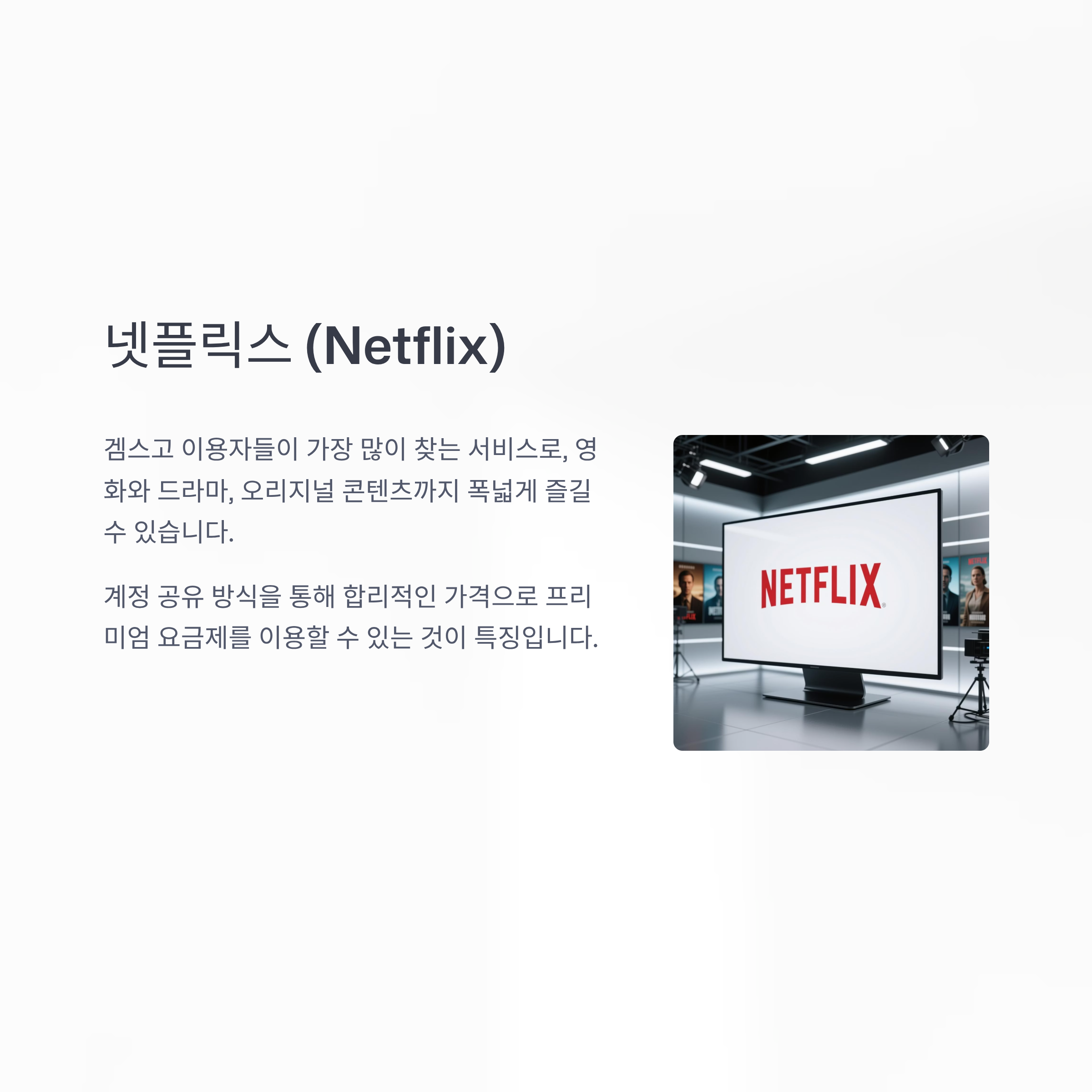 겜스고 이용자들이 가장 많이 찾는 서비스로, 영화와 드라마, 오리지널 콘텐츠까지 폭넓게 즐길 수 있습니다. 계정 공유 방식을 통해 합리적인 가격으로 프리미엄 요금제를 이용할 수 있는 것이 특징입니다.