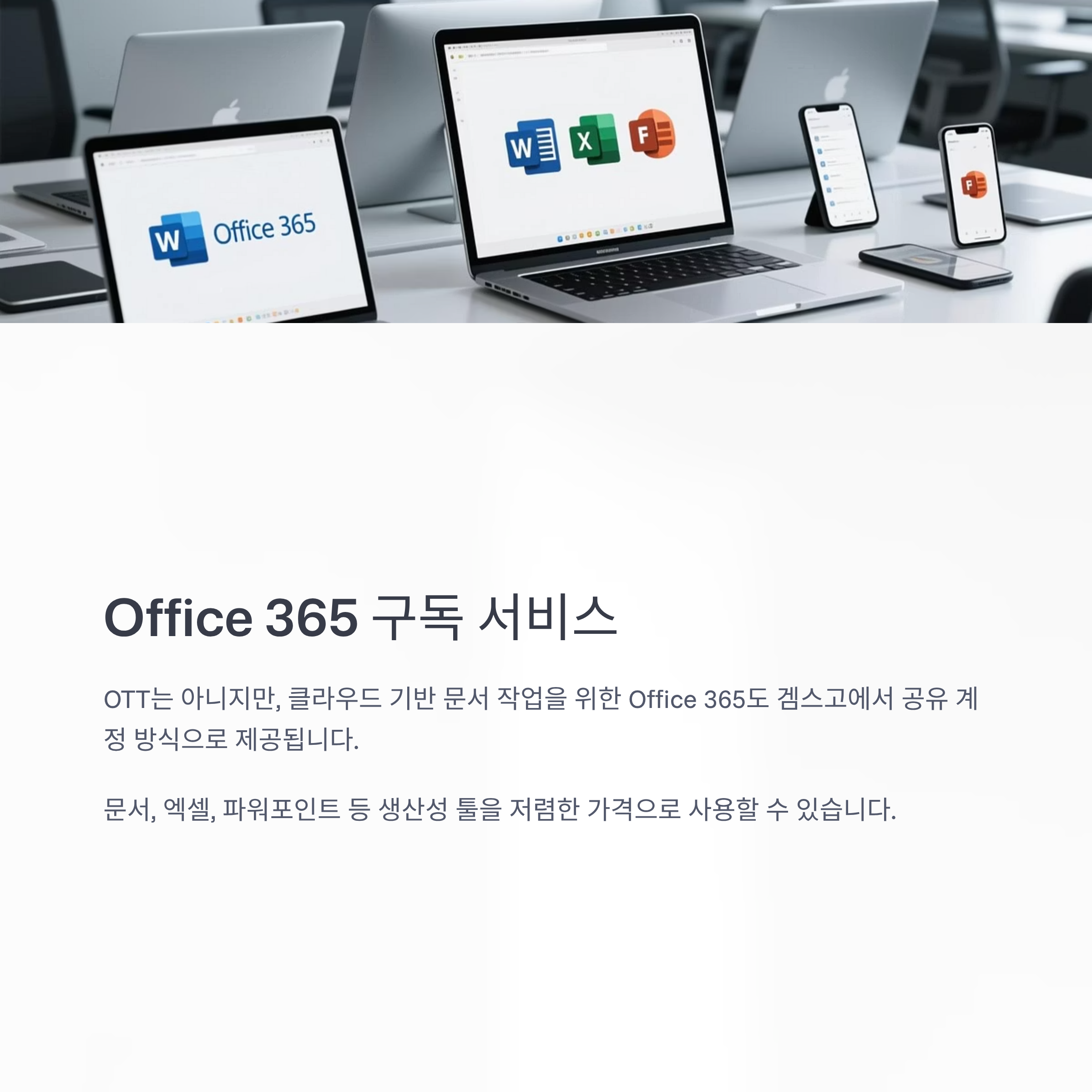 OTT는 아니지만, 클라우드 기반 문서 작업을 위한 Office 365도 겜스고에서 공유 계정 방식으로 제공됩니다. 문서, 엑셀, 파워포인트 등 생산성 툴을 저렴한 가격으로 사용할 수 있습니다.