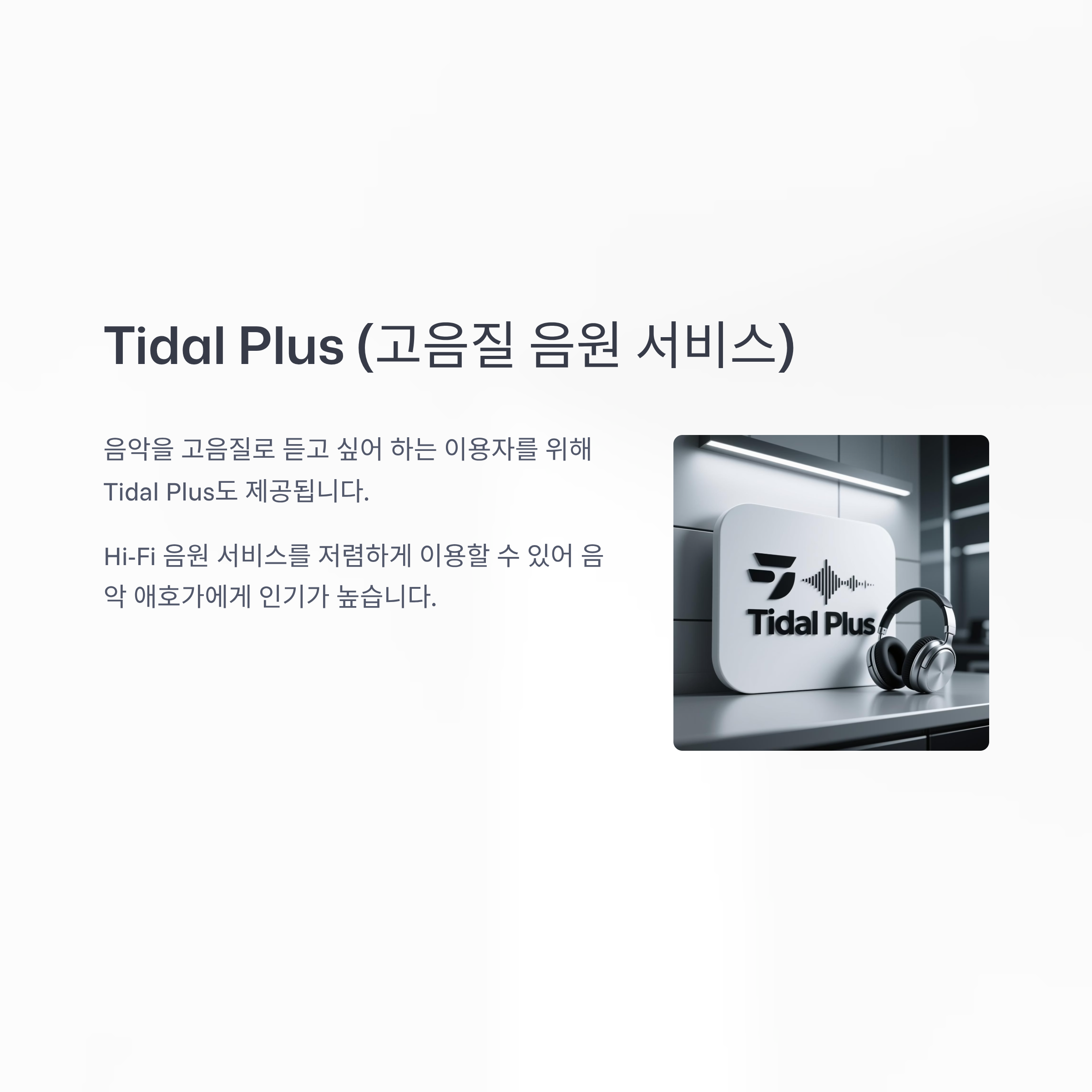| 음악 스트리밍 | 스포티파이, Tidal Plus | 광고 없는 음원, 고음질 서비스 |