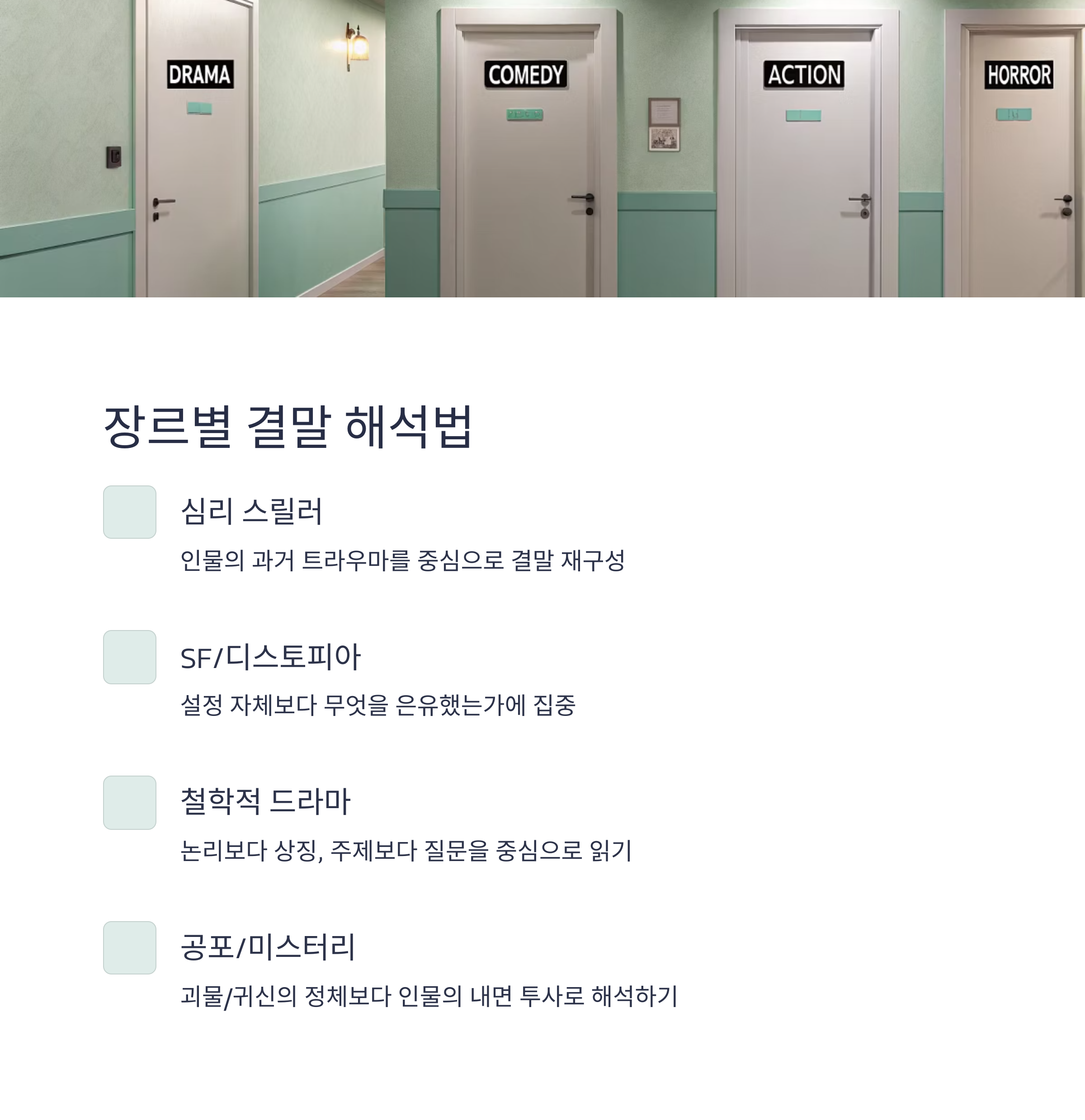 - 공포/미스터리: 괴물/귀신의 정체보다 인물의 내면 투사로 해석하기