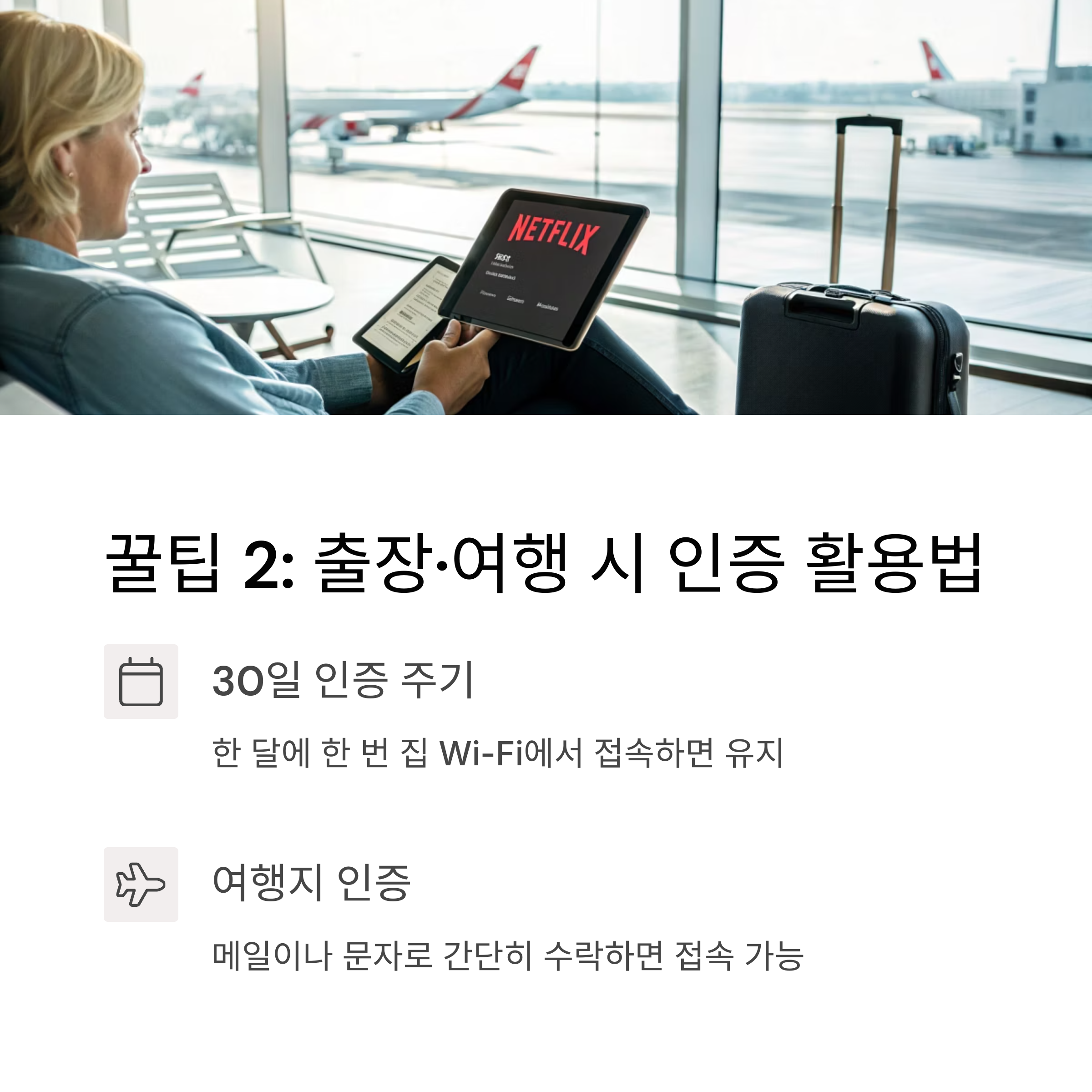 즉, 한 달에 한 번만 집에서 로그인하면 출장 중에도 정상 시청 가능합니다.