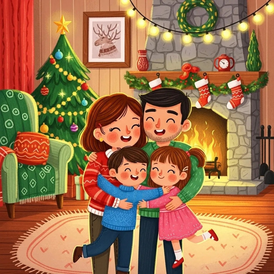 AI 활용 크리스마스 장식으로 꾸며진 집에서 행복하게 안고 있는 가족
