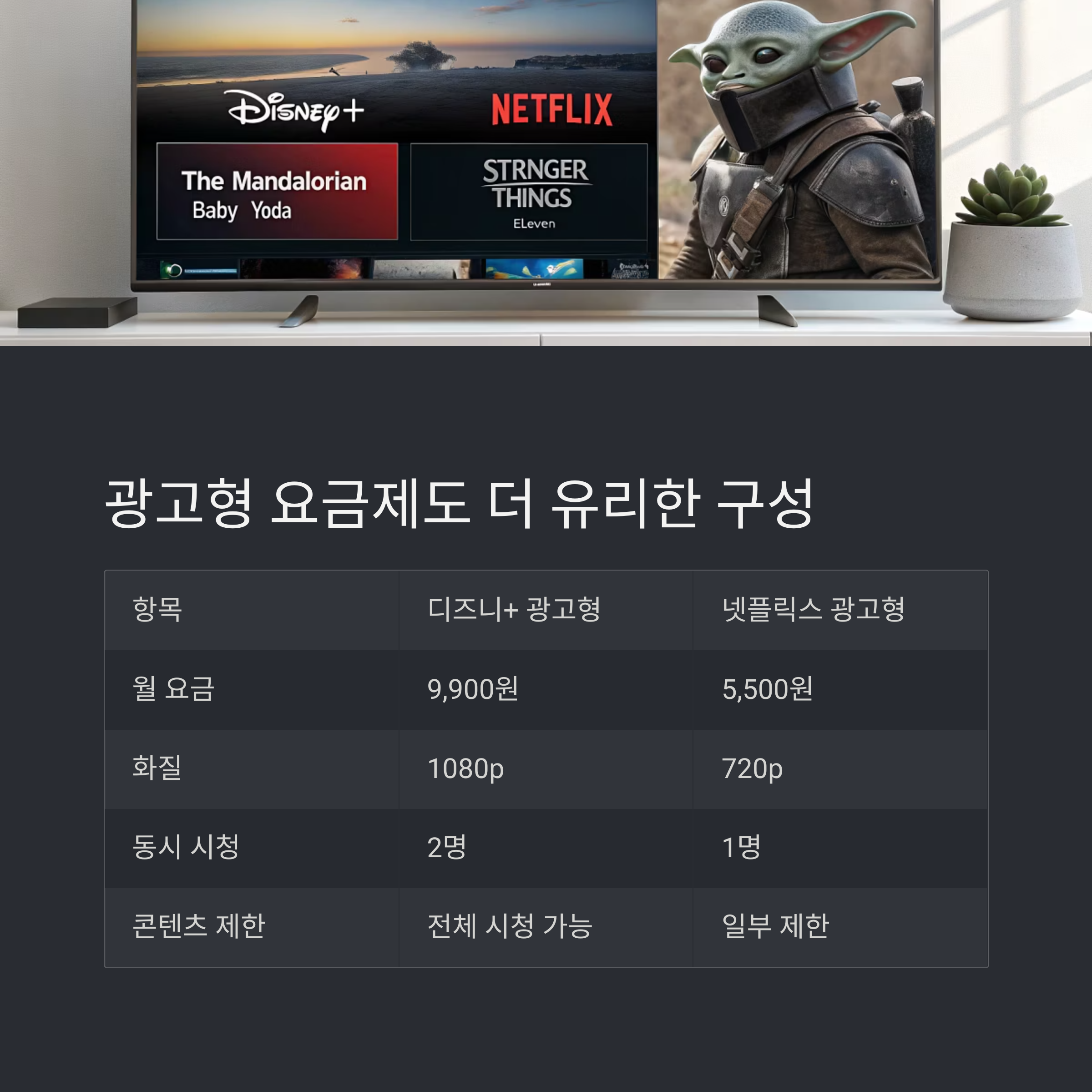 조금 더 비싸더라도 디즈니플러스 광고형이 훨씬 나은 화질과 기능을 제공합니다.