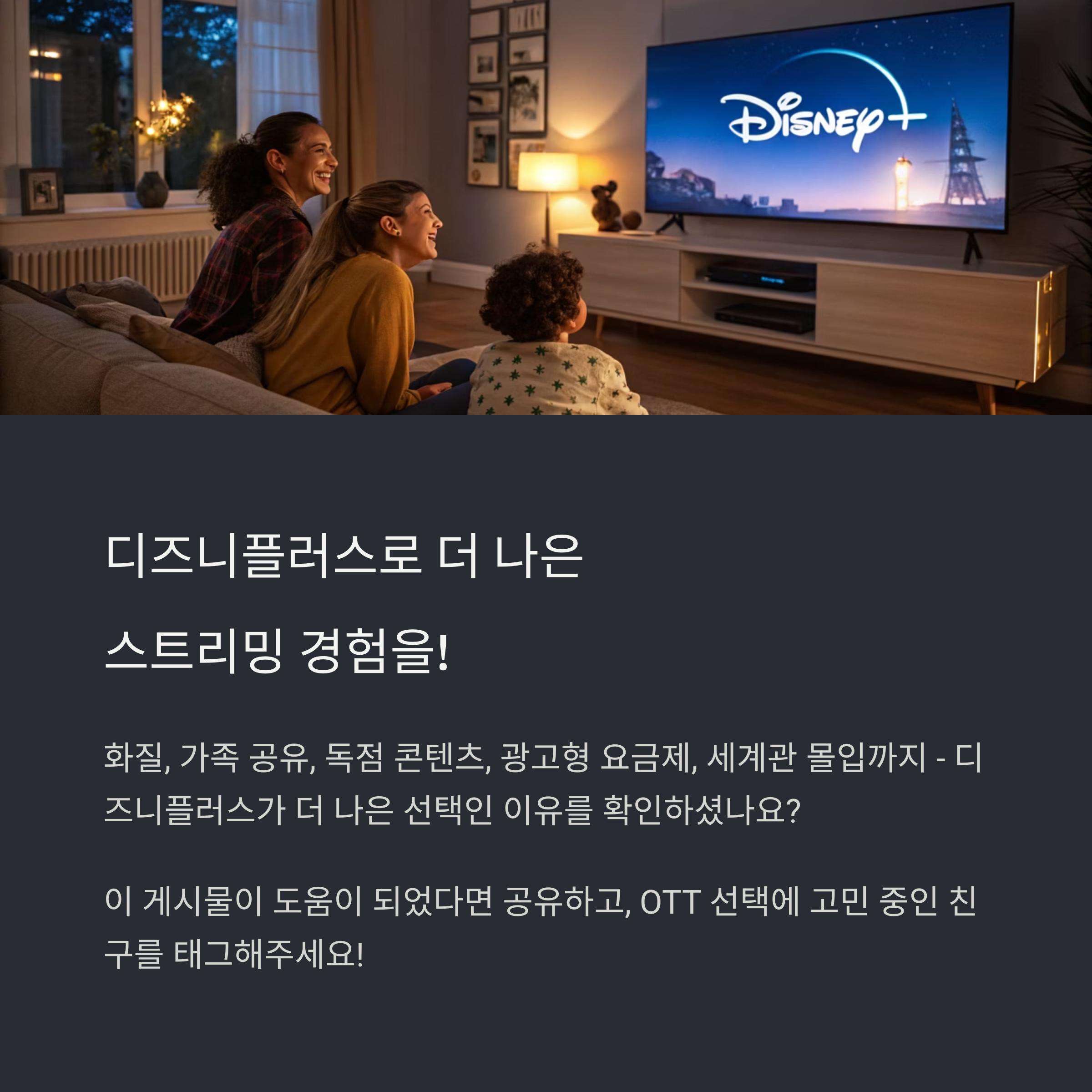디즈니플러스는 브랜드 파워, 세계관 집중도, 가격 대비 혜택 면에서 확실한 강점을 보입니다.
