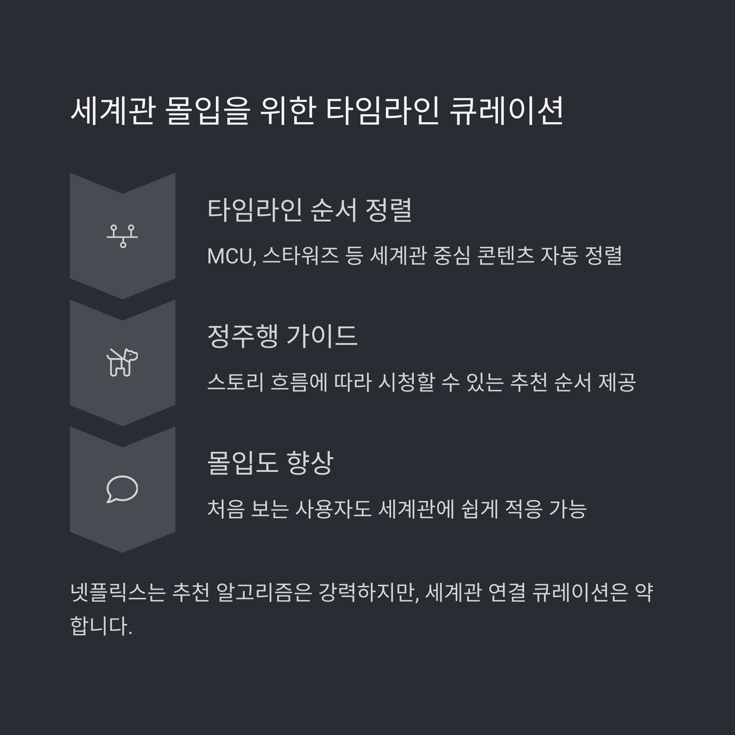 디즈니플러스는 MCU, 스타워즈 등 세계관 중심 콘텐츠를 타임라인 순서로 자동 정렬해줍니다.