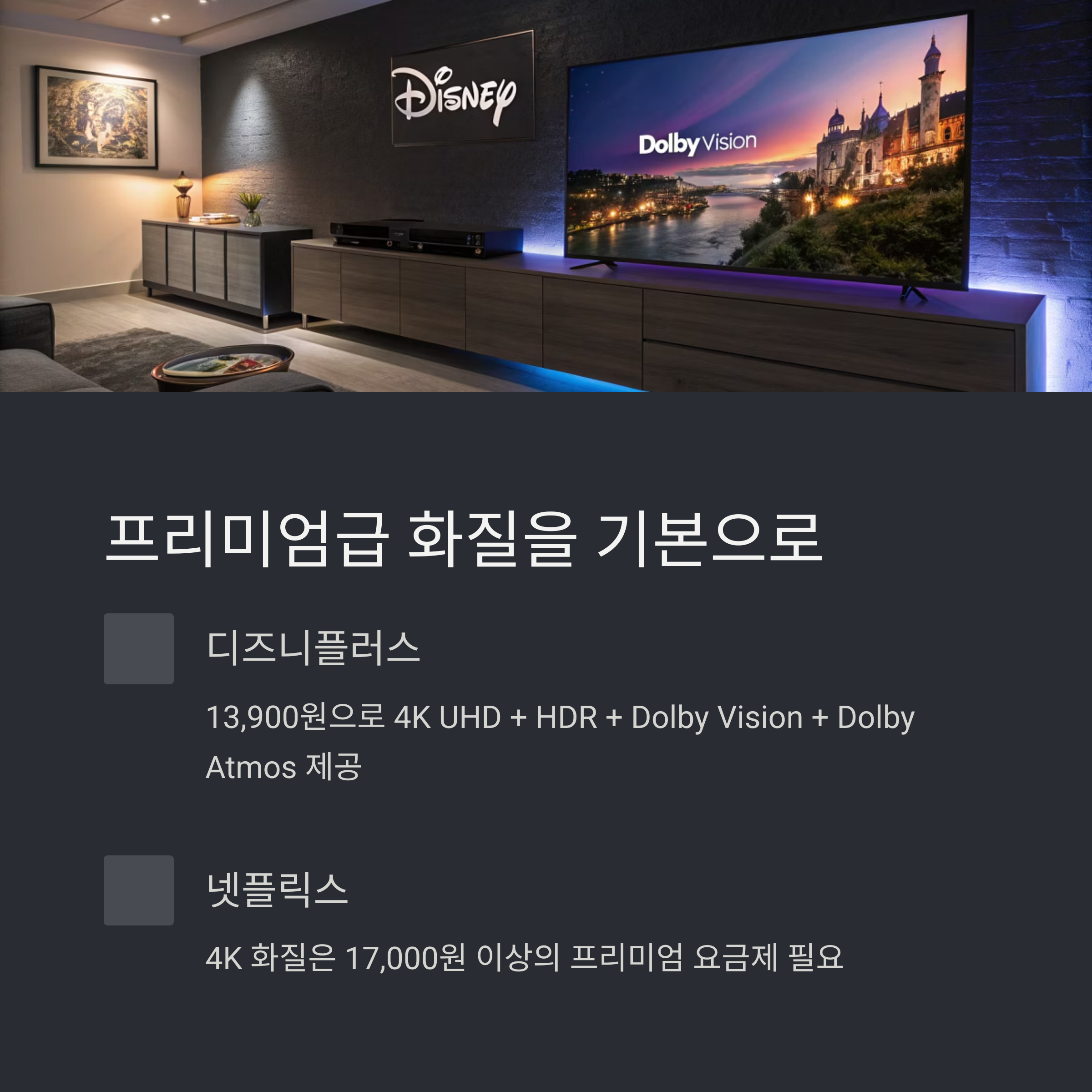 같은 가격대에서 제공하는 화질과 음향의 수준이 디즈니플러스가 더 앞섭니다.