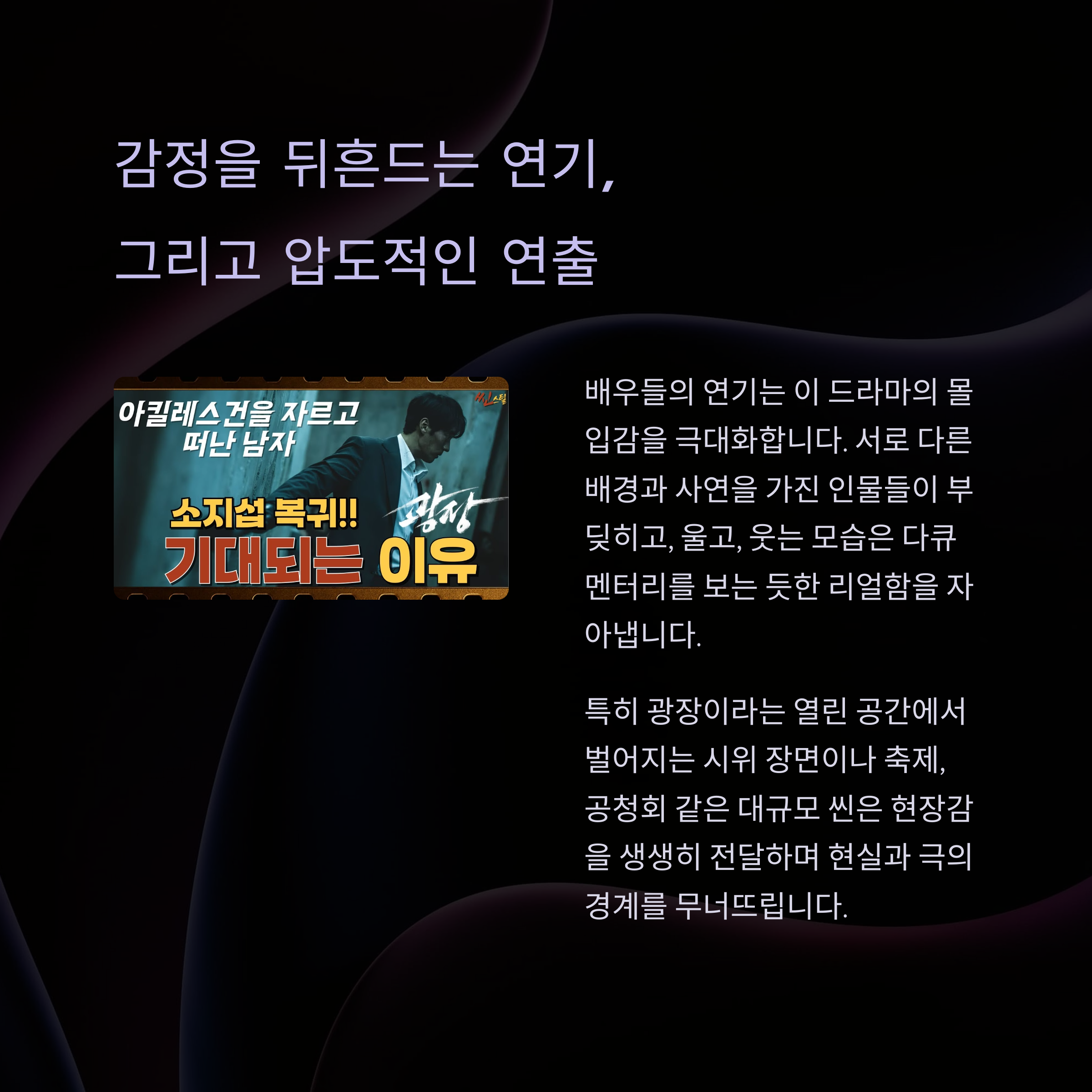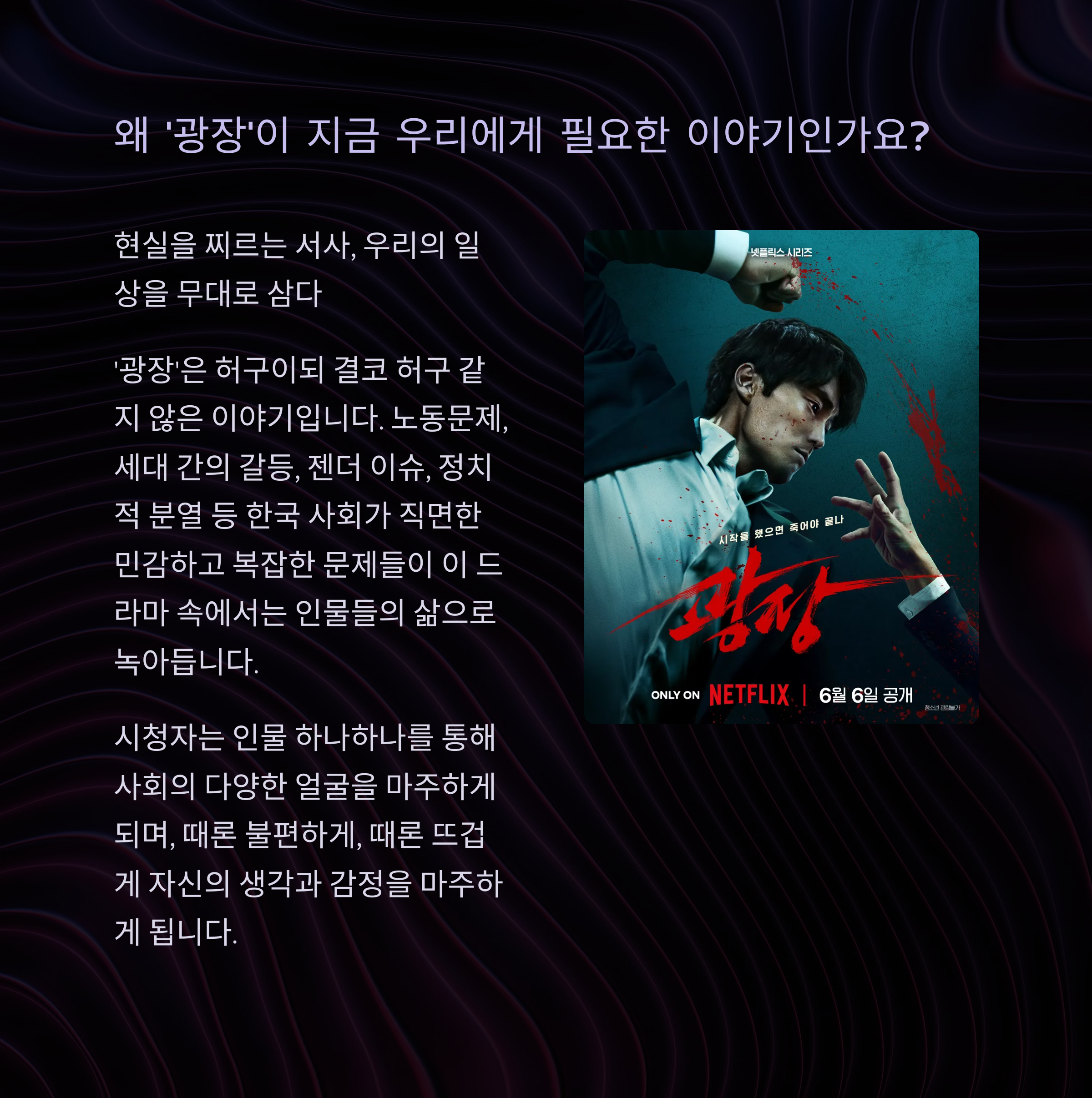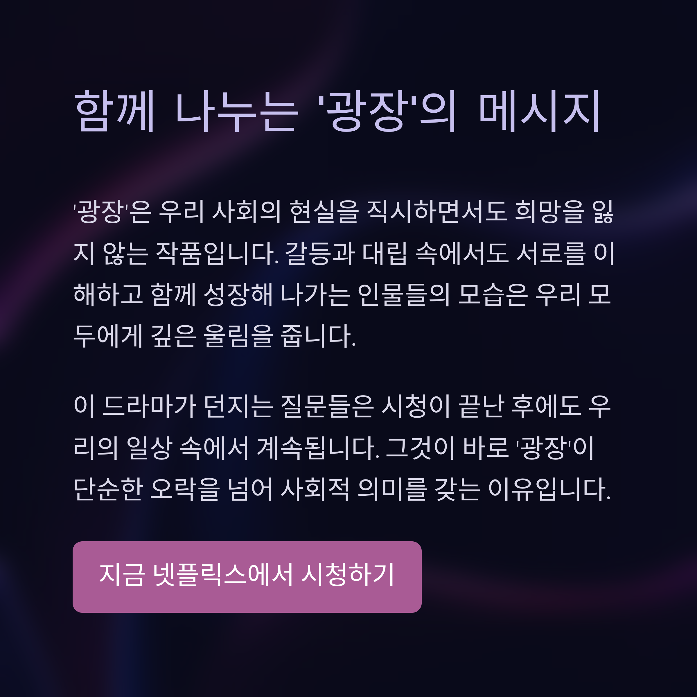 넷플릭스 오리지널 시리즈 ‘광장’이 공개되자마자 폭발적인 반응을 얻고 있습니다. 단순한 휴먼드라마를 넘어 사회적, 정치적 현실을 깊이 있게 다룬 이 작품은 지금 이 시대를 살아가는 우리 모두의 이야기로 다가옵니다. 갈등과 연대, 침묵과 외침이 공존하는 광장이라는 공간은 단순한 배경이 아니라 상징 그 자체입니다. 이 글에서는 ‘광장’이 왜 그렇게 뜨겁게 사랑받고 있는지, 그리고 이 드라마가 우리에게 던지는 메시지를 함께 살펴보겠습니다.