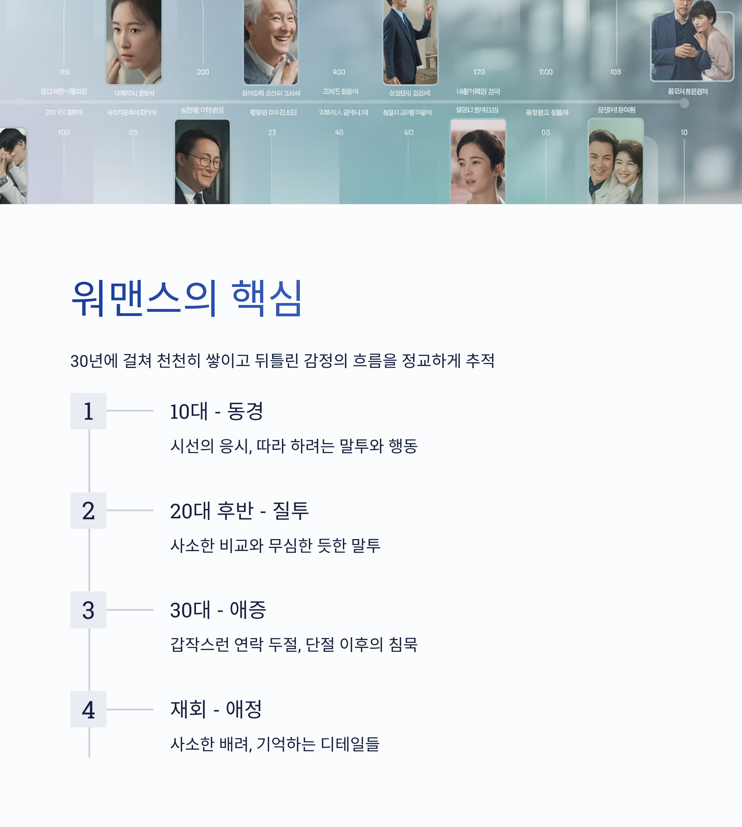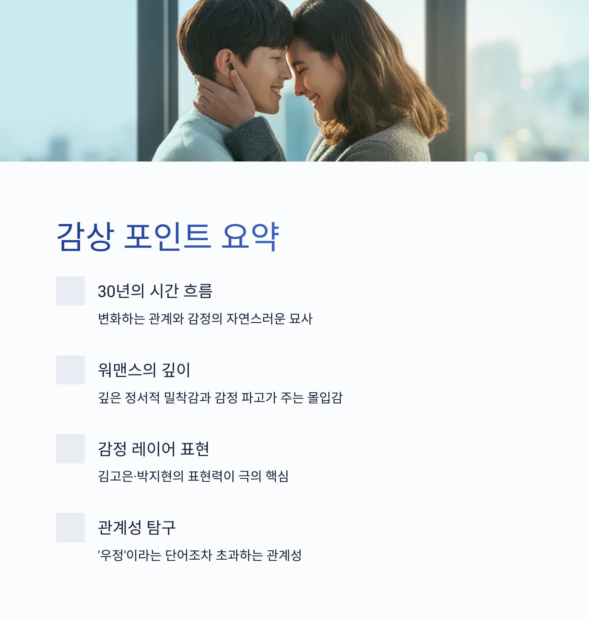 ✅ 30년의 시간 흐름에 따라 변화하는 관계와 감정의 자연스러운 묘사