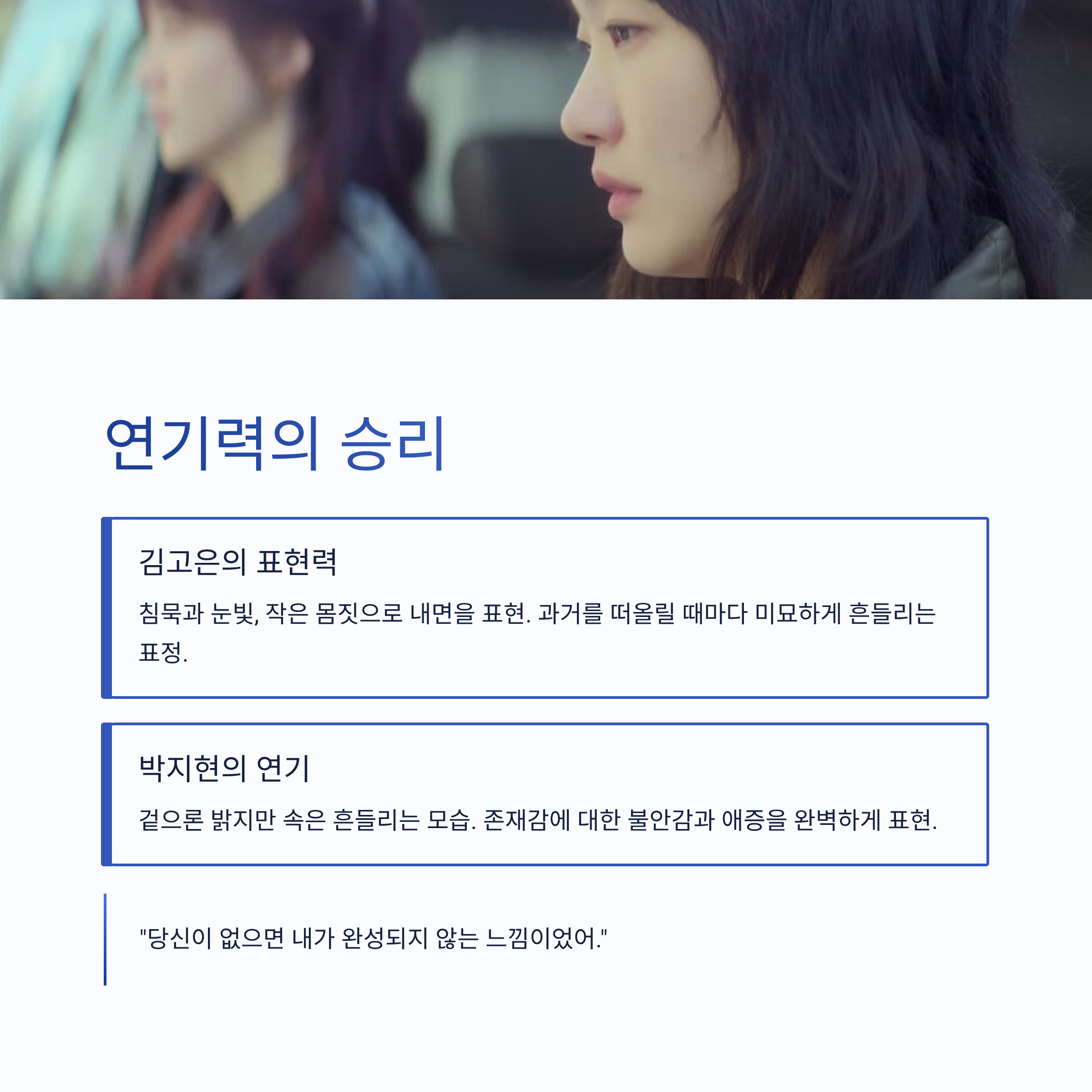 김고은과 박지현, 두 배우의 정교한 감정 연기는 질투와 동경, 애증과 애정이라는 이질적인 감정이 얼마나 가까이 맞닿아 있는지를 생생하게 보여줍니다.