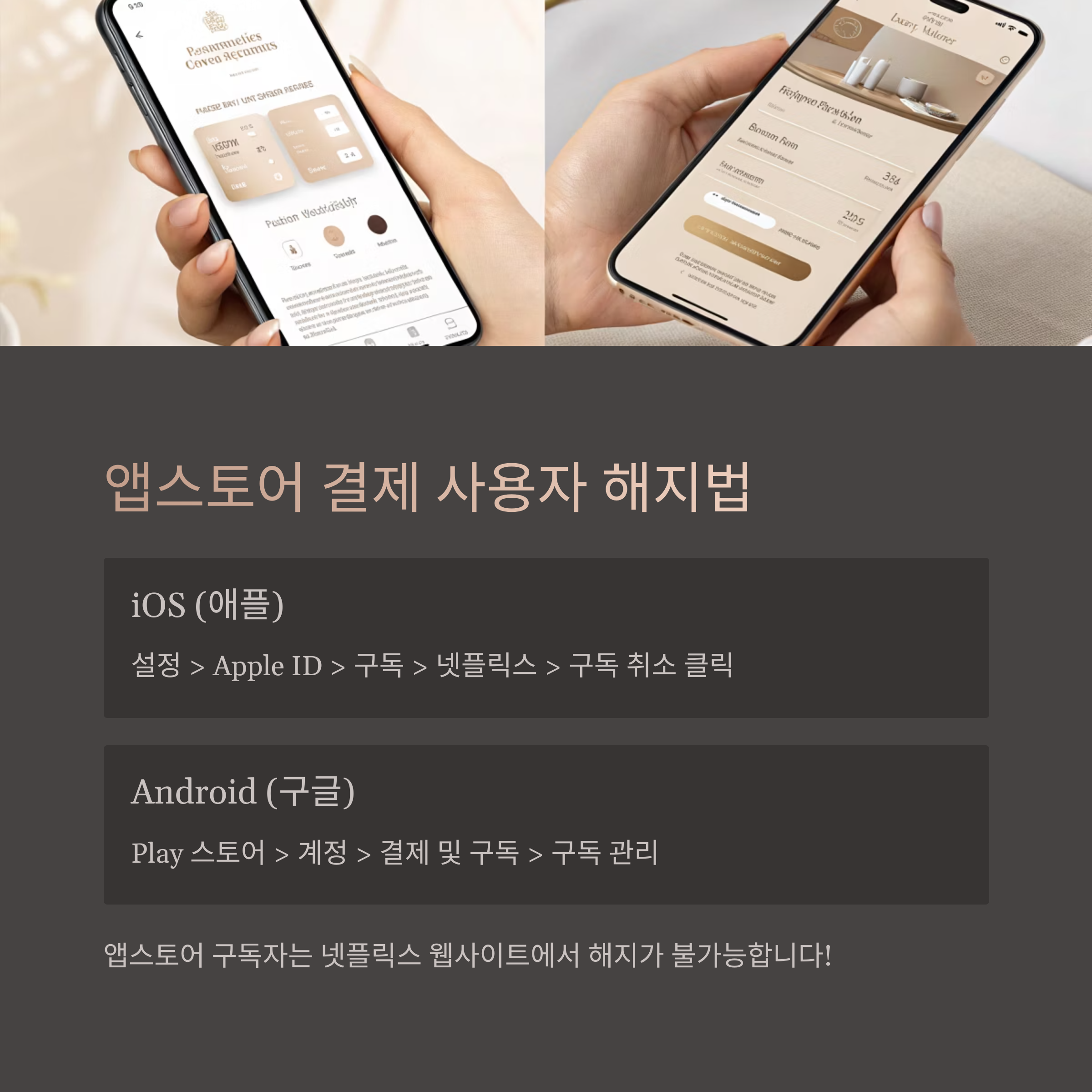 | iOS (애플) | 설정 > Apple ID > 구독 > 넷플릭스 > 구독 취소 클릭 |