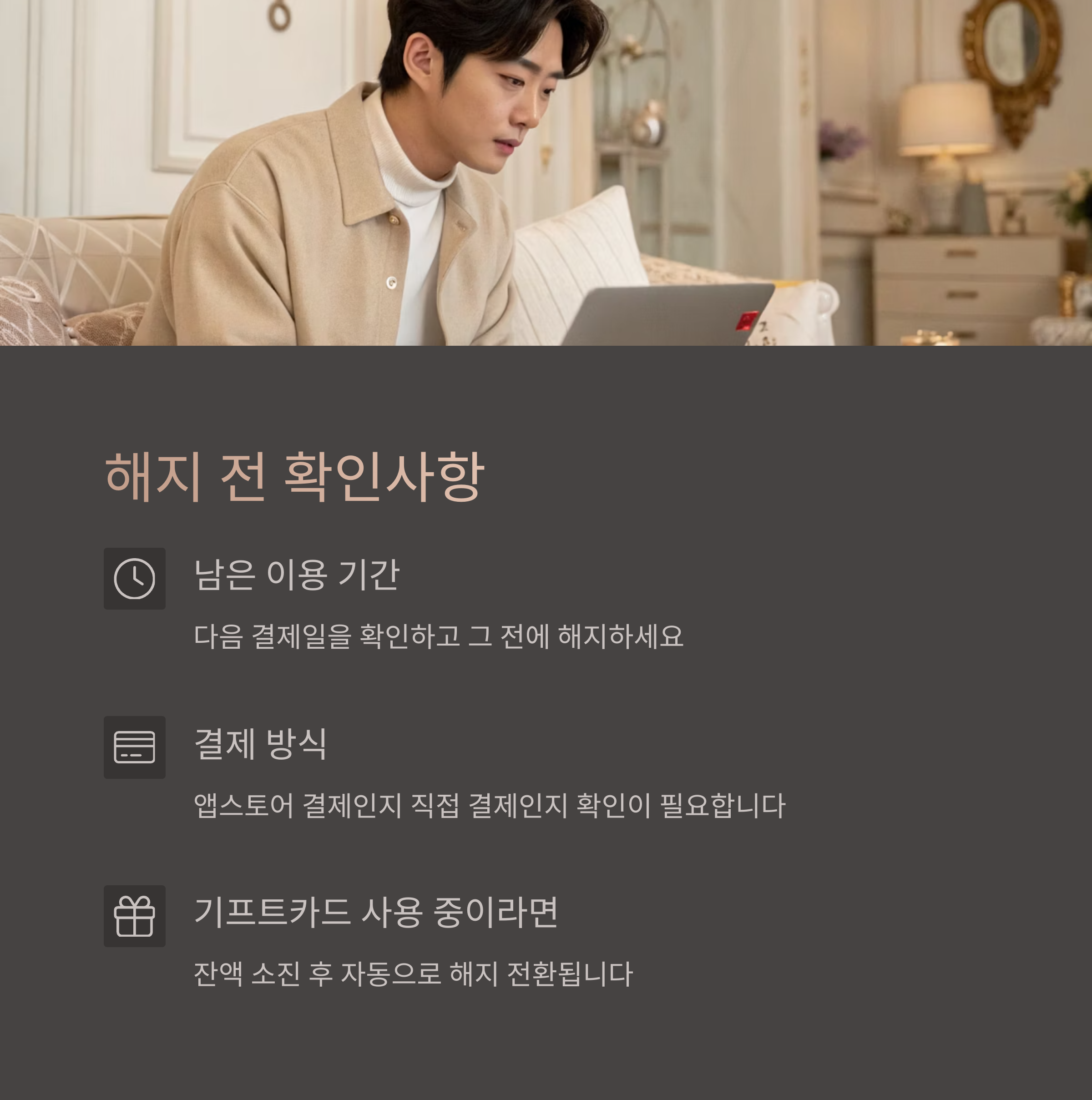 | 해지 전 체크사항 | 남은 날짜 확인, 결제일 이전 처리 필수 |