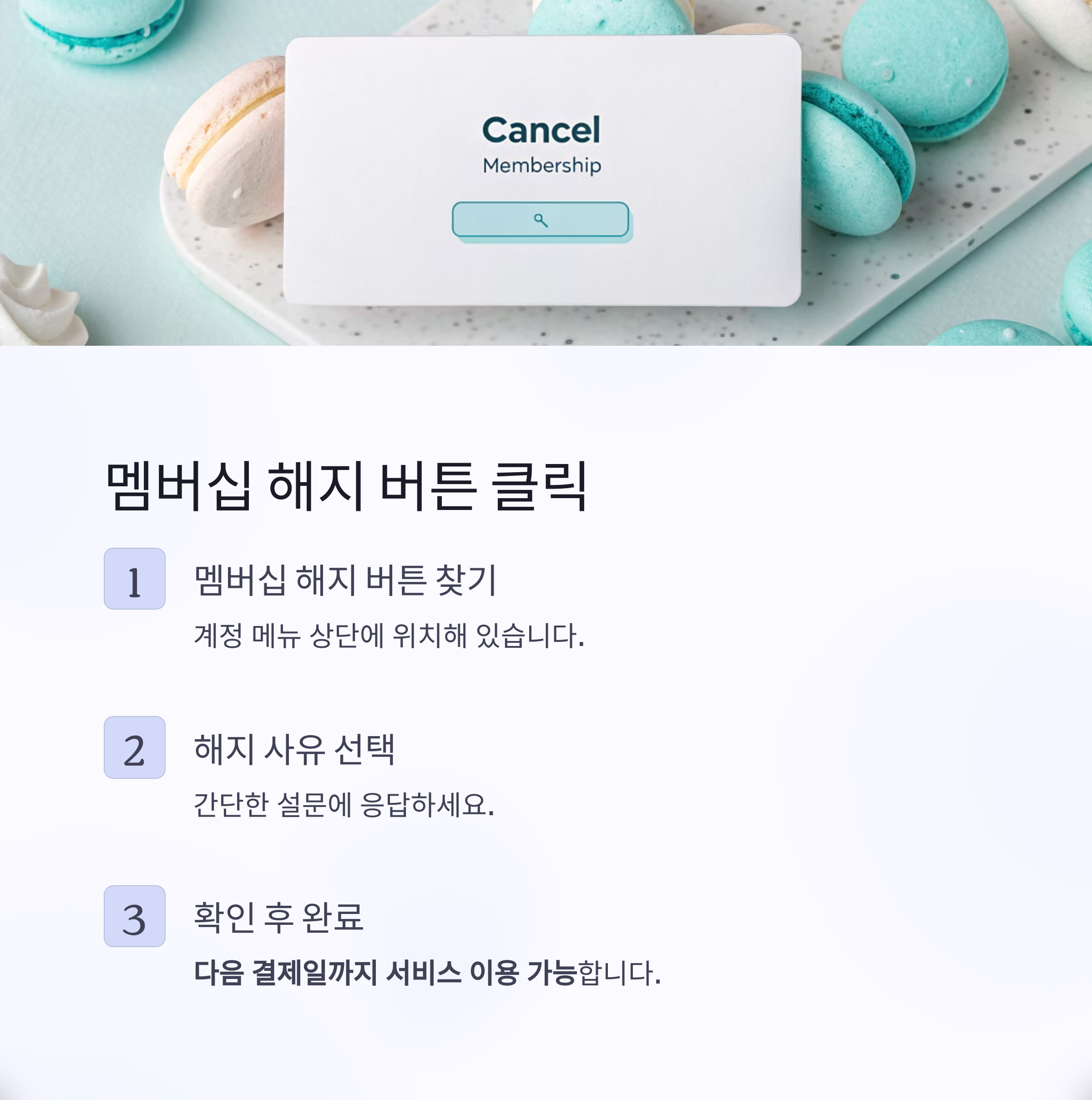 - 계정 메뉴 상단에 ‘멤버십 해지’ 버튼이 존재합니다.