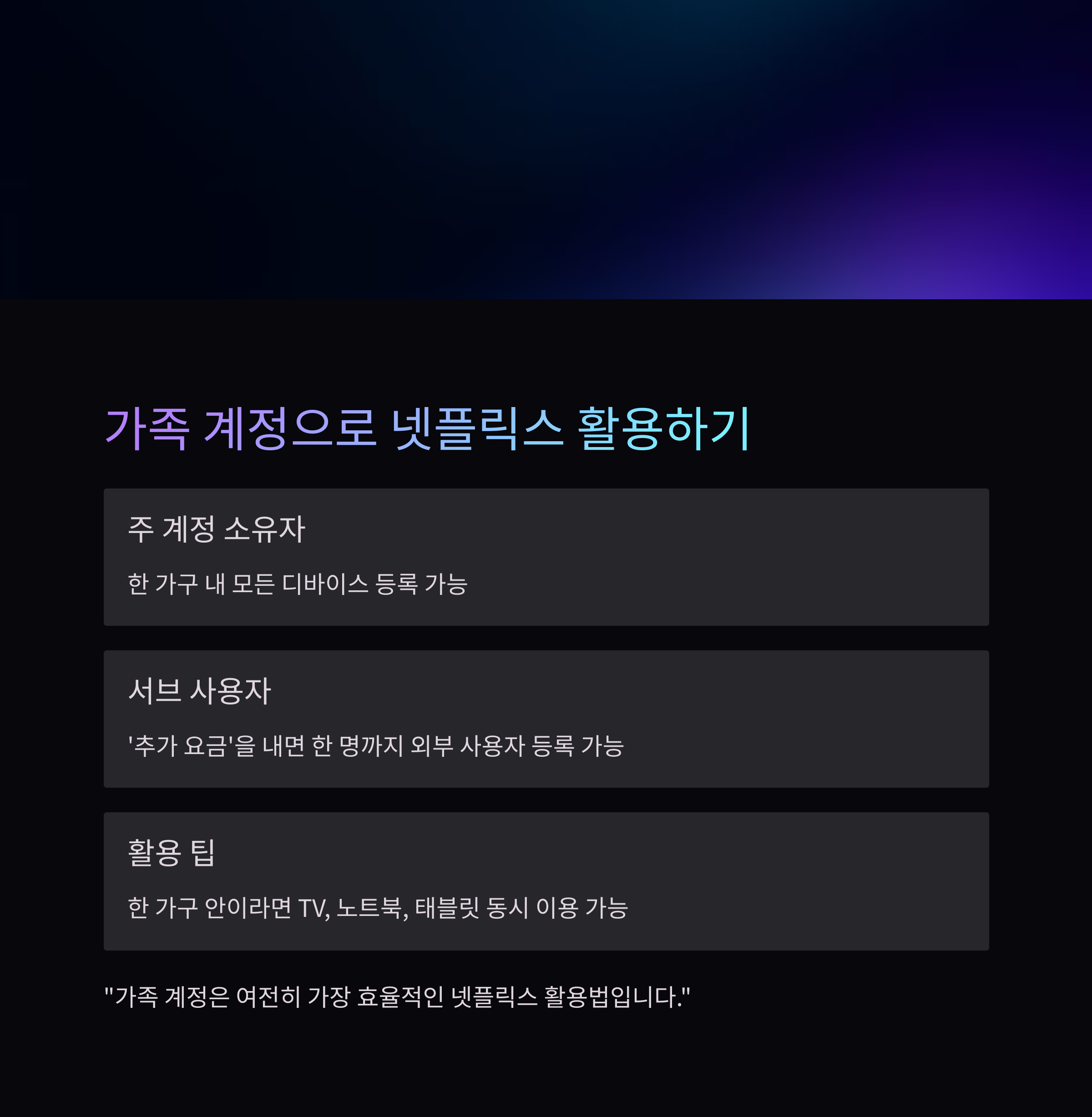 "가족 계정은 여전히 가장 효율적인 넷플릭스 활용법입니다."