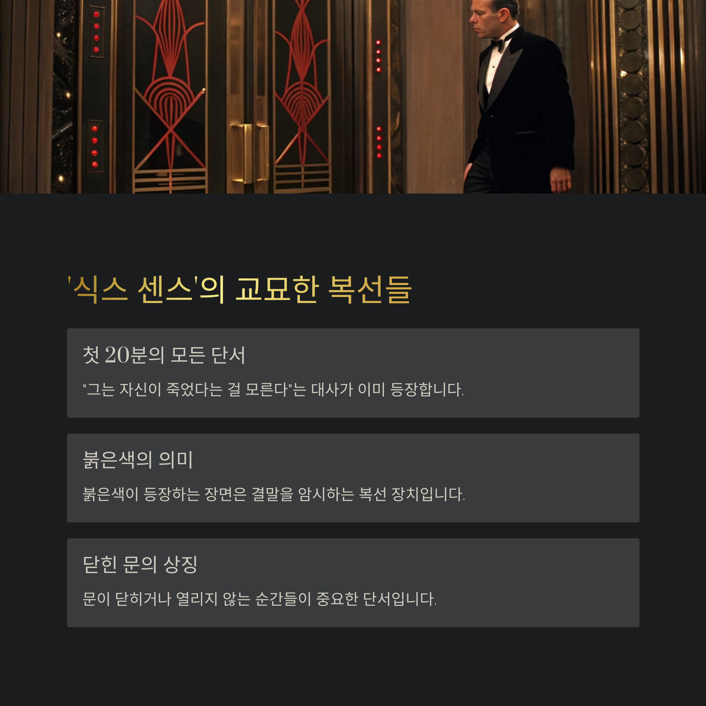 시각적 복선 | 색감, 소품, 공간 배치로 정보 제공 | 식스 센스, 인셉션 |
