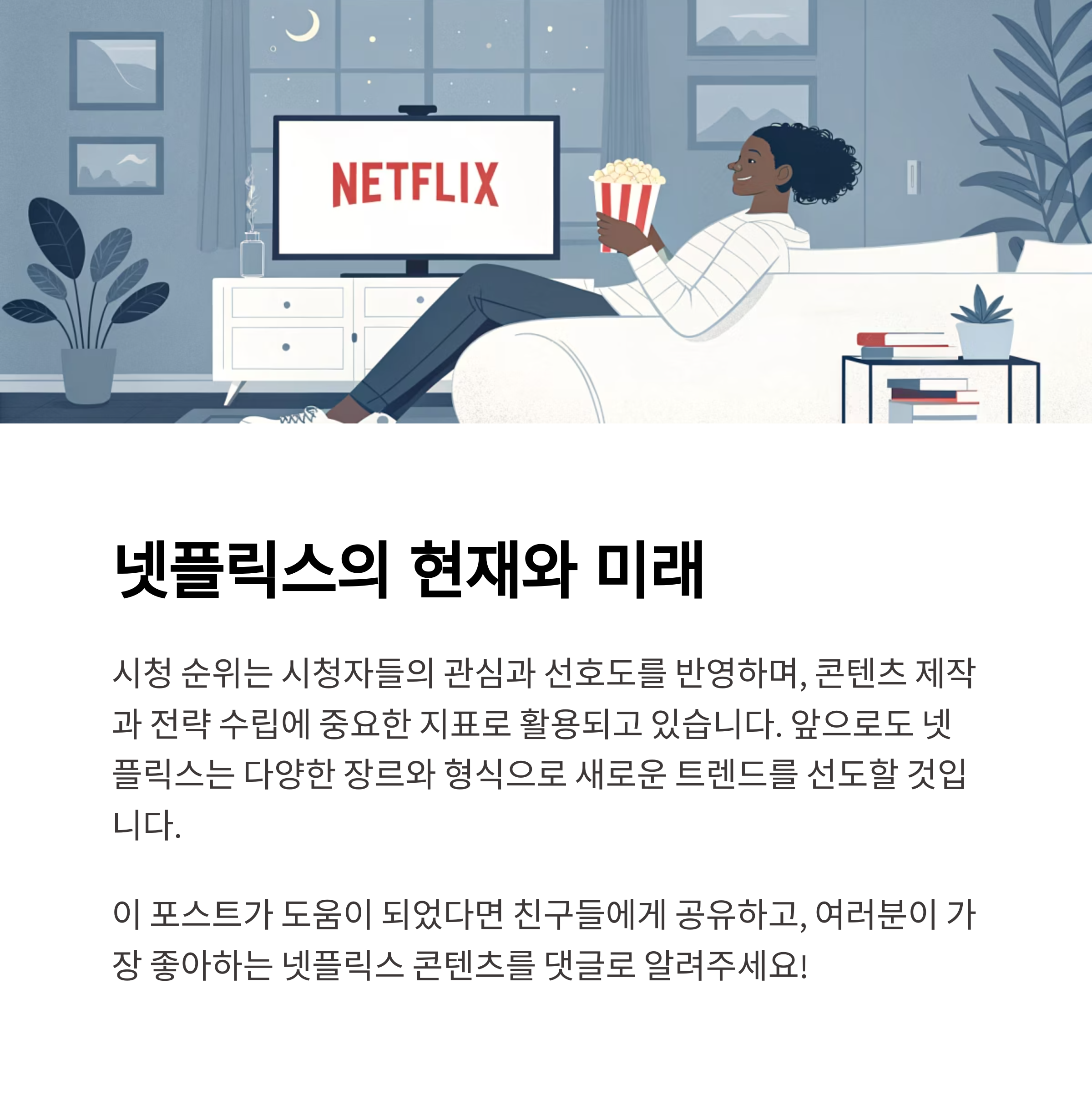넷플릭스의 시청 순위는 시청자들의 관심과 선호도를 반영하며, 콘텐츠 제작과 전략 수립에 중요한 지표로 활용되고 있습니다.