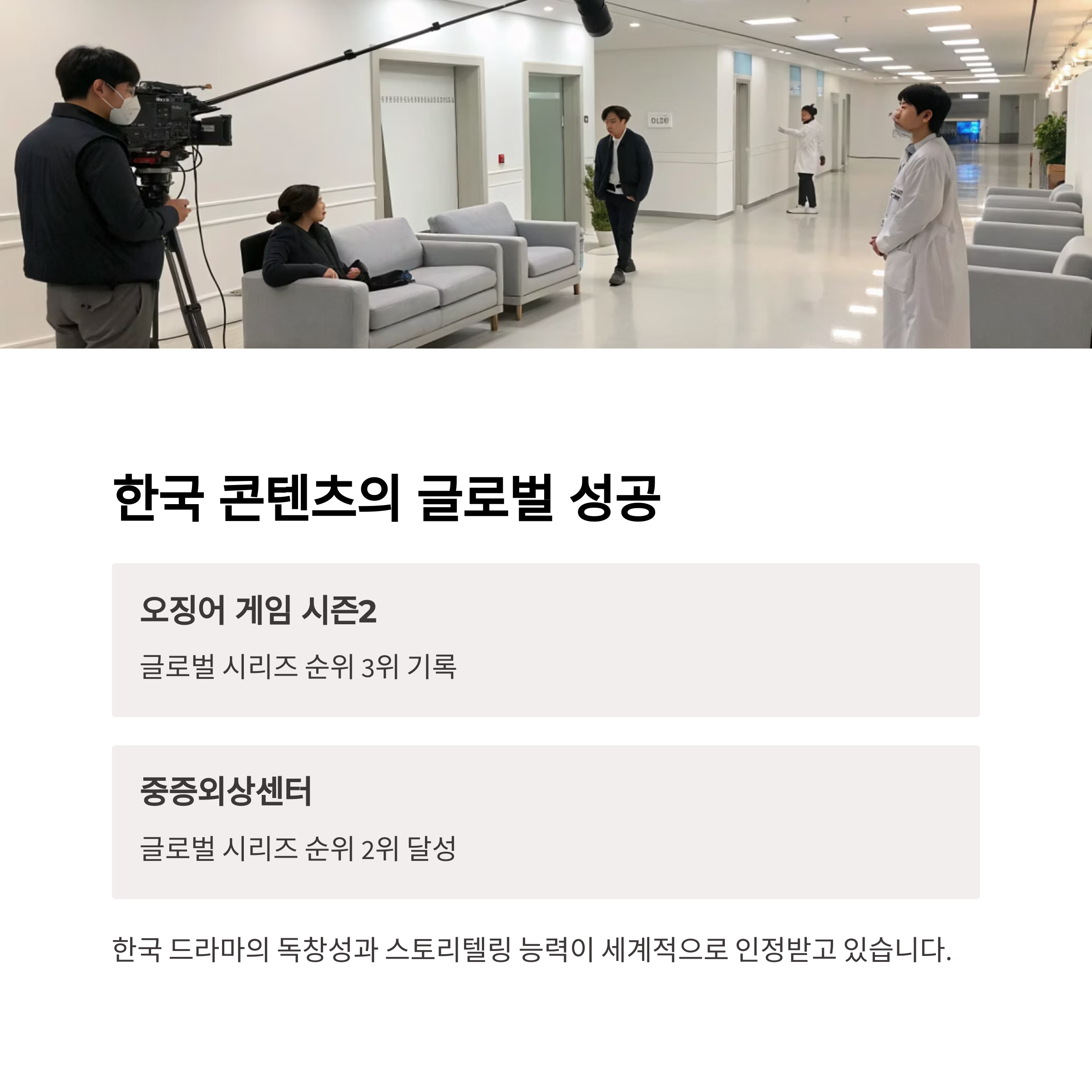 한국 드라마 '오징어 게임 시즌2'와 '중증외상센터'는 넷플릭스 글로벌 시리즈 순위에서 각각 3위와 2위를 차지하며, 한국 콘텐츠의 위상을 높이고 있습니다. ([넷플릭스]2025년 1월 본 넷플릭스 시리즈와 영화, 넷플릭스 글로벌 ...)
