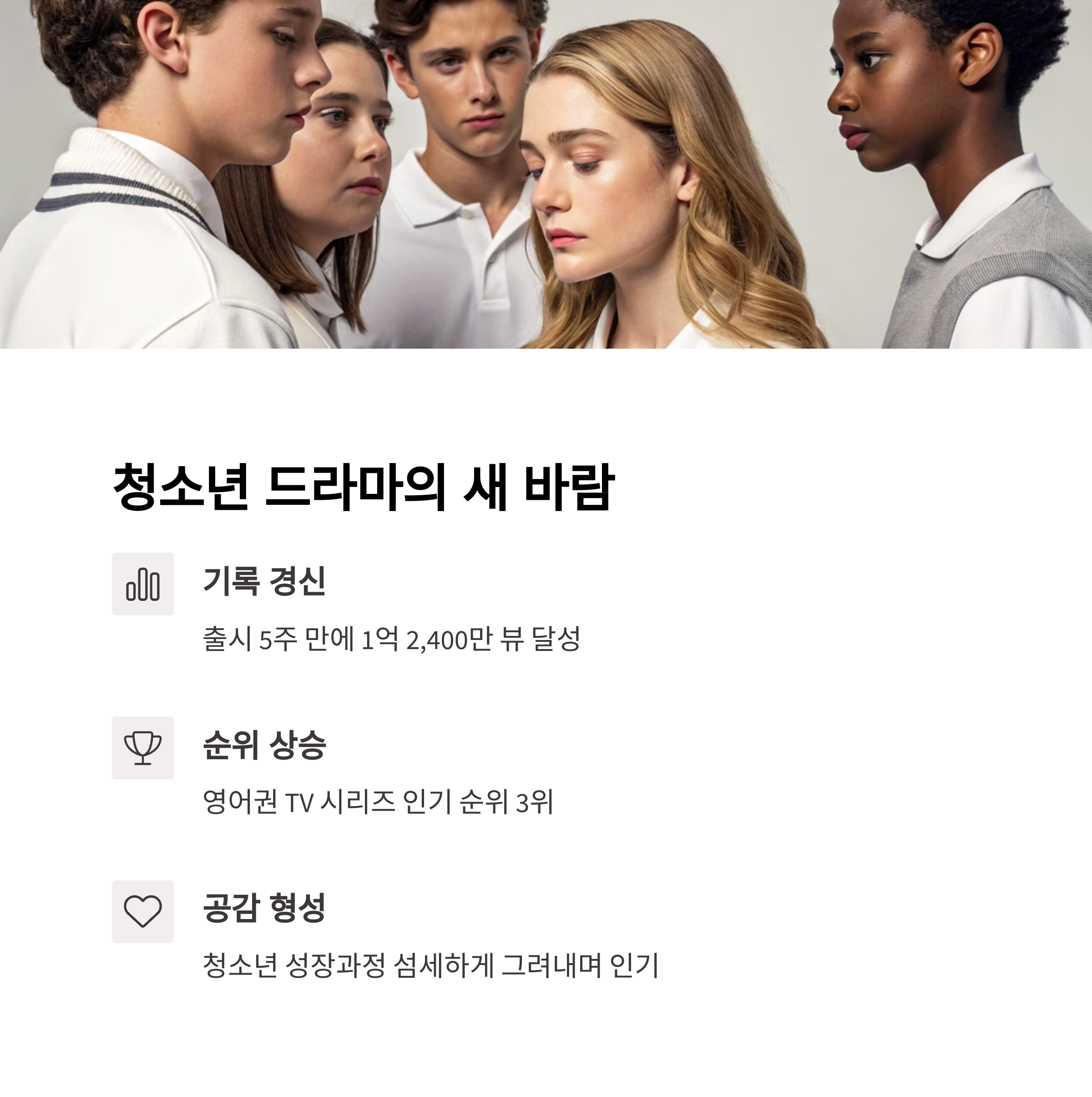 이 드라마는 청소년들의 성장과정을 섬세하게 그려내며, 전 세계 시청자들의 공감을 얻고 있습니다.
