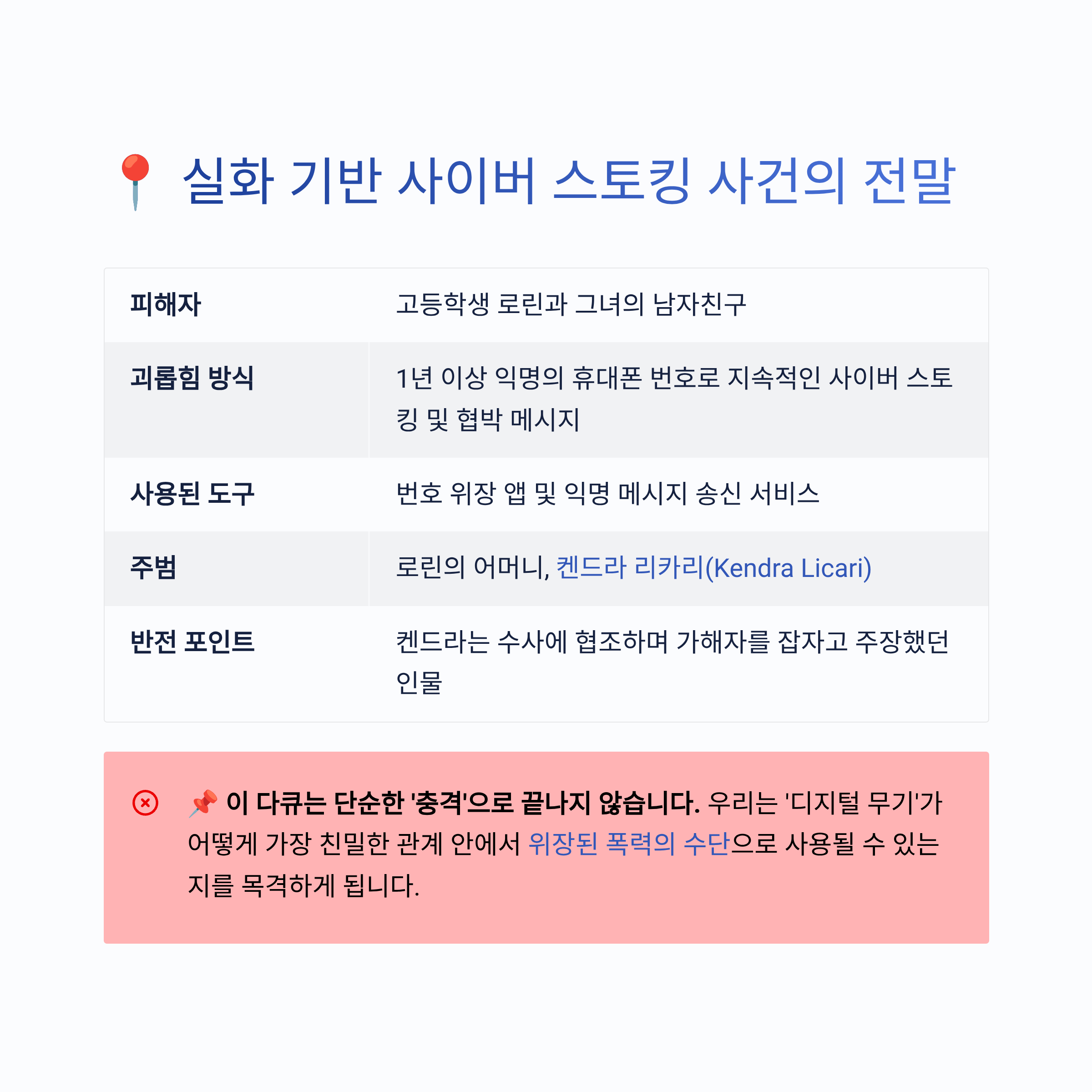 | 핵심 사건 | 1년 넘게 이어진 사이버 스토킹, 가해자는 피해자의 어머니 |