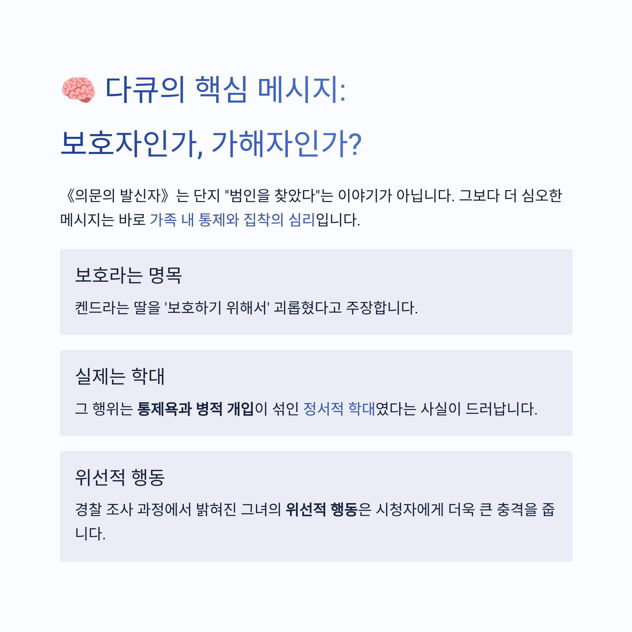 - 하지만 그 행위는 통제욕과 병적 개입이 섞인 정서적 학대였다는 사실이 드러납니다.