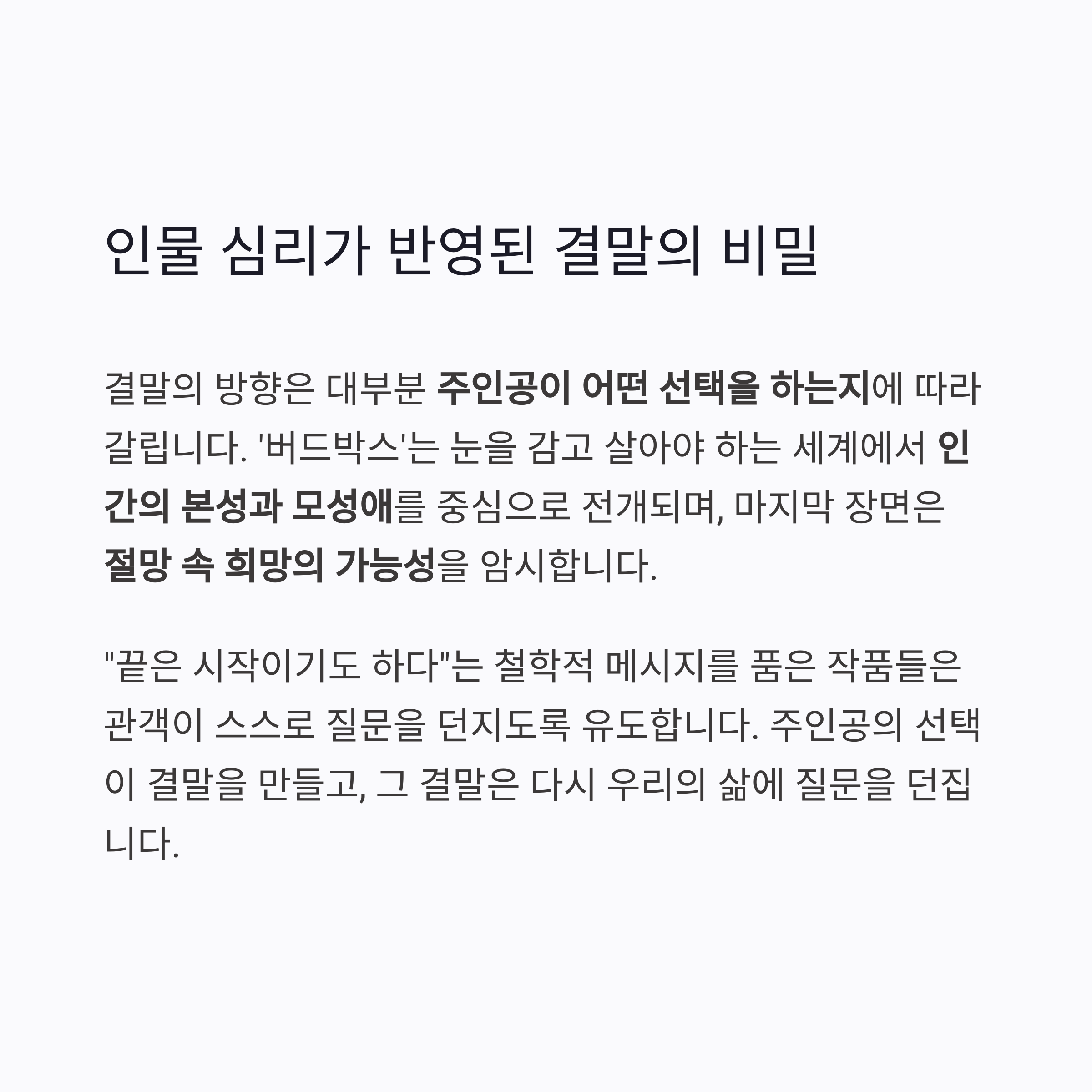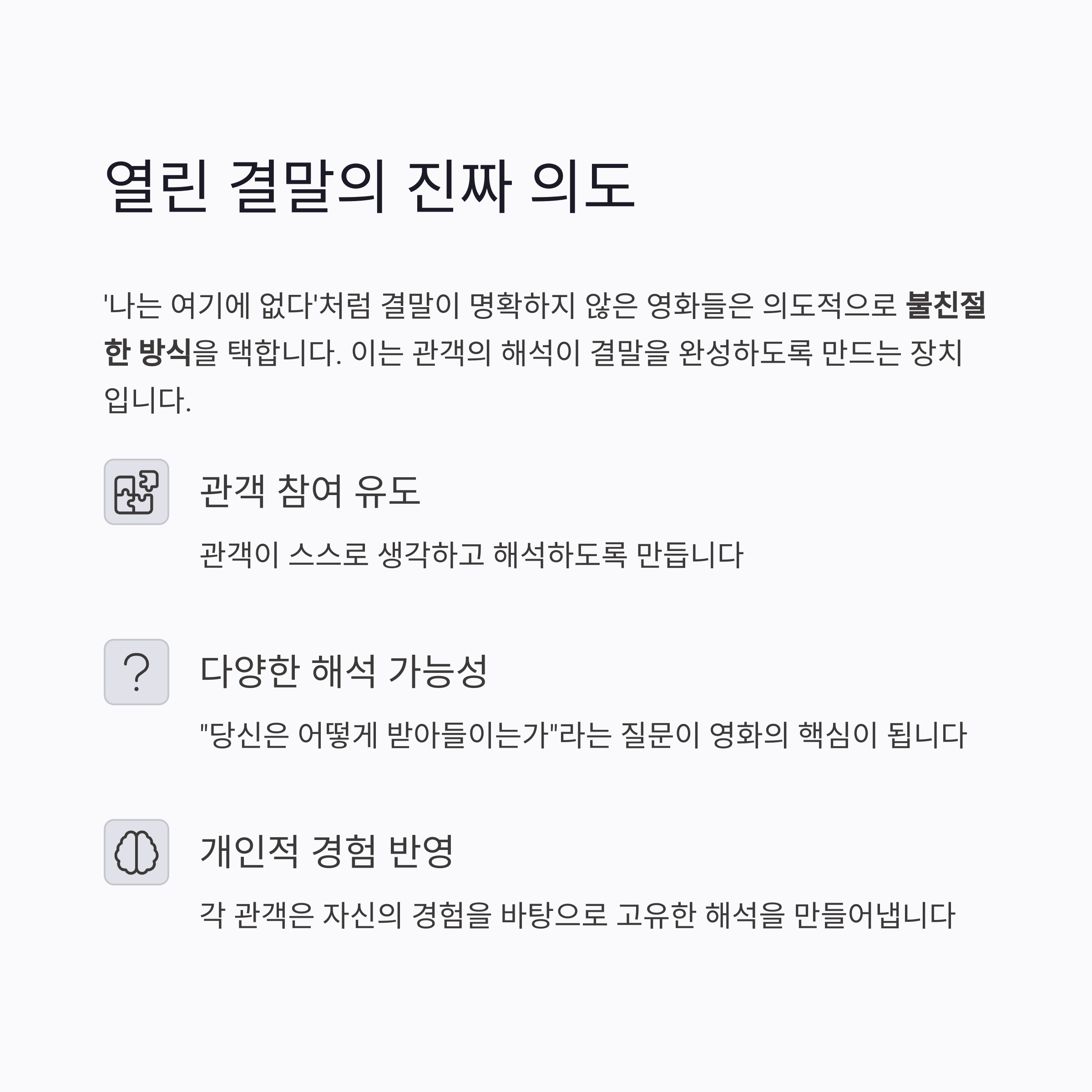 이런 결말은 관객이 스스로 질문을 던지도록 유도합니다