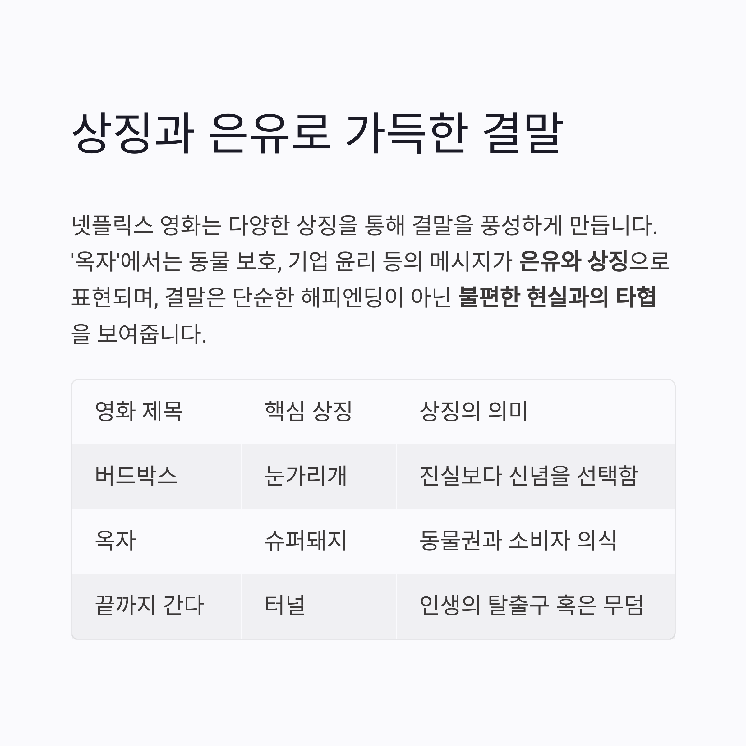 넷플릭스 오리지널 영화들의 결말에는 단순한 이야기 이상의 은유적 의미와 감독의 철학이 담겨 있습니다