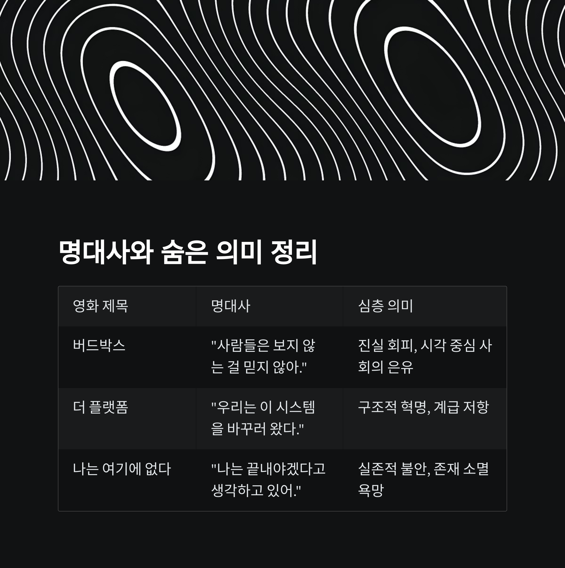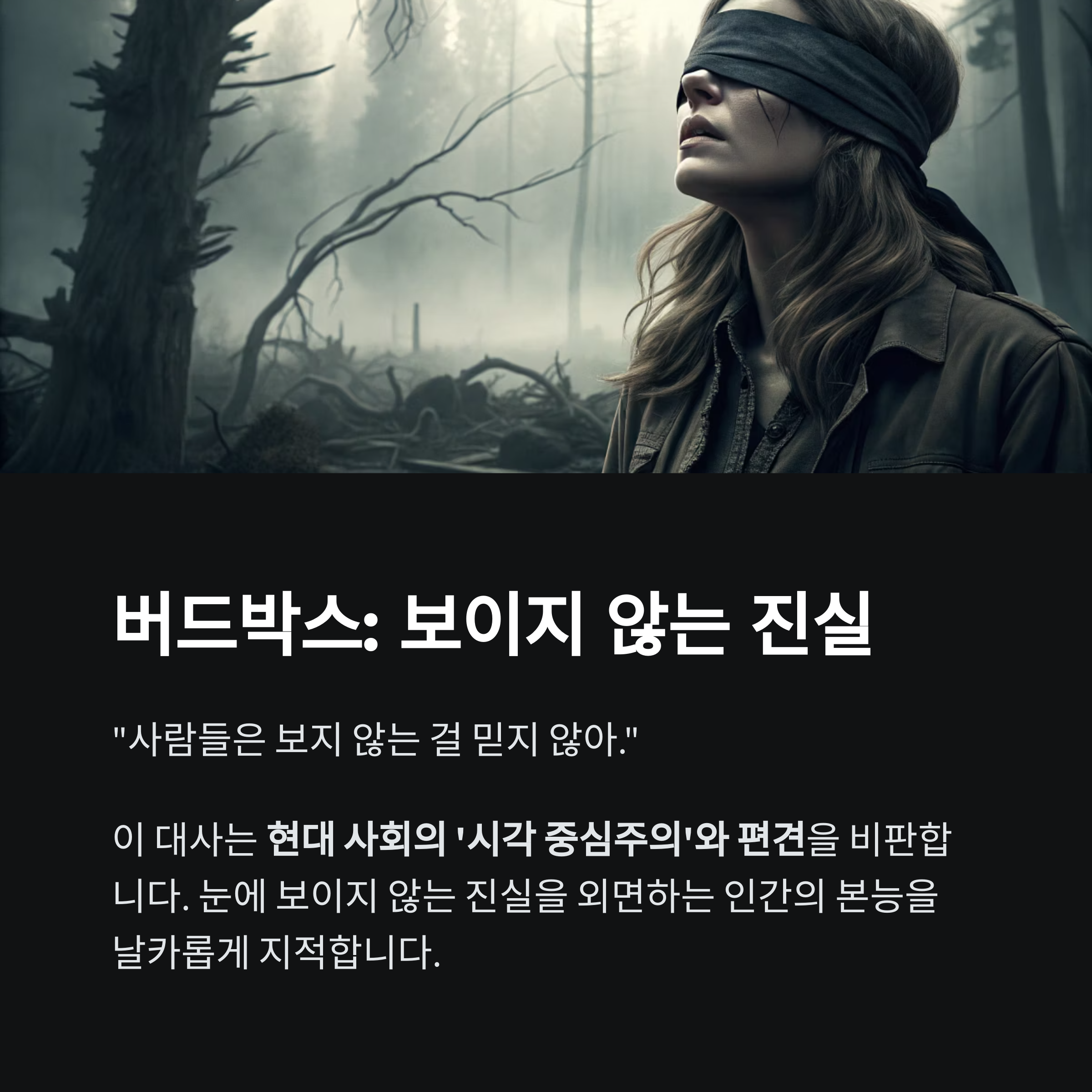 | 버드박스 | "사람들은 보지 않는 걸 믿지 않아." | 진실 회피, 시각 중심 사회의 은유 |