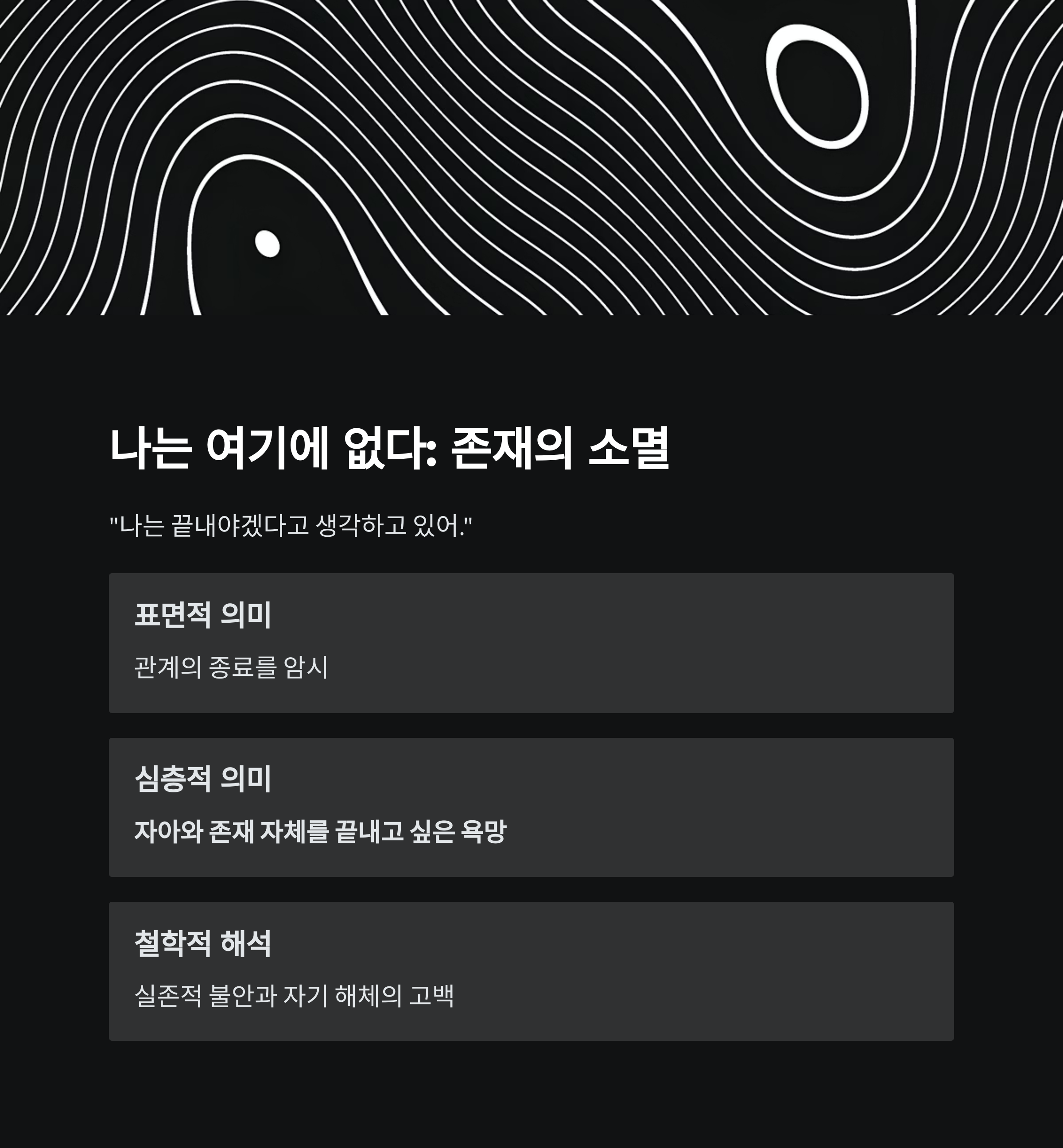 | 나는 여기에 없다 | "나는 끝내야겠다고 생각하고 있어." | 실존적 불안, 존재 소멸 욕망 |