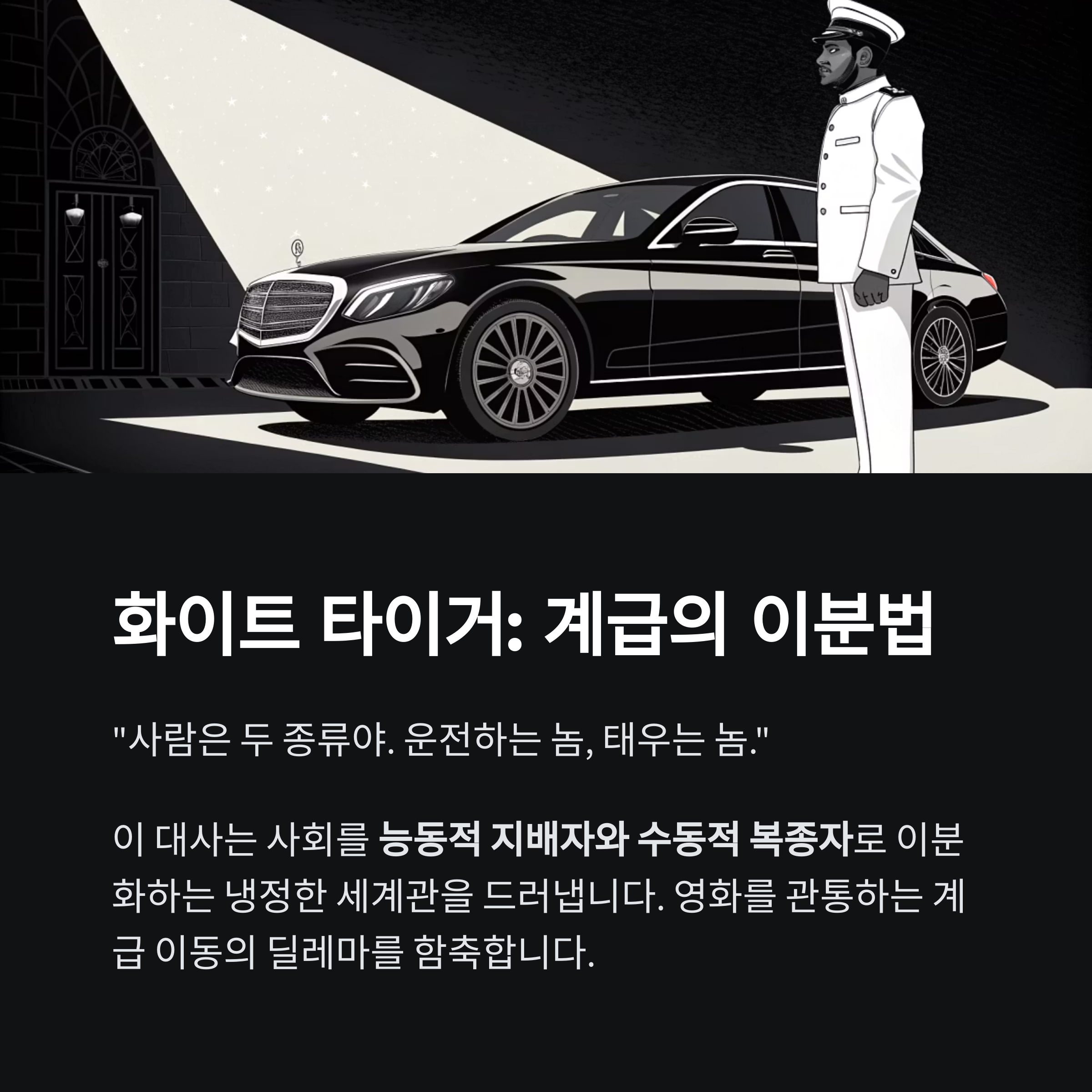 | 화이트 타이거 | "사람은 두 종류야. 운전하는 놈, 태우는 놈." | 계급 분리, 인간의 능동성과 수동성에 대한 통찰 |