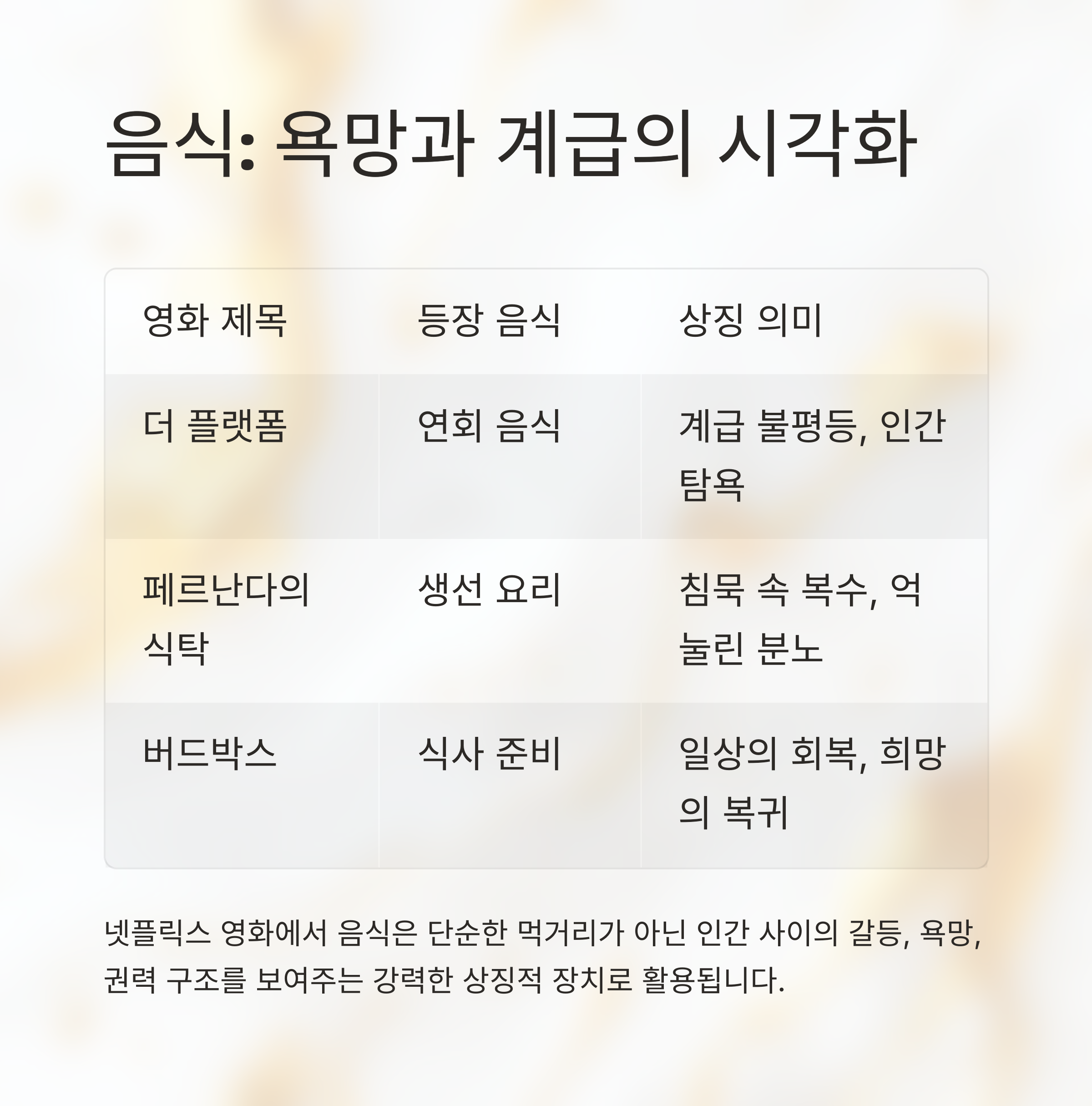 음식은 단순한 먹거리가 아니라 인간 사이의 갈등, 욕망, 권력 구조를 보여주는 장치입니다