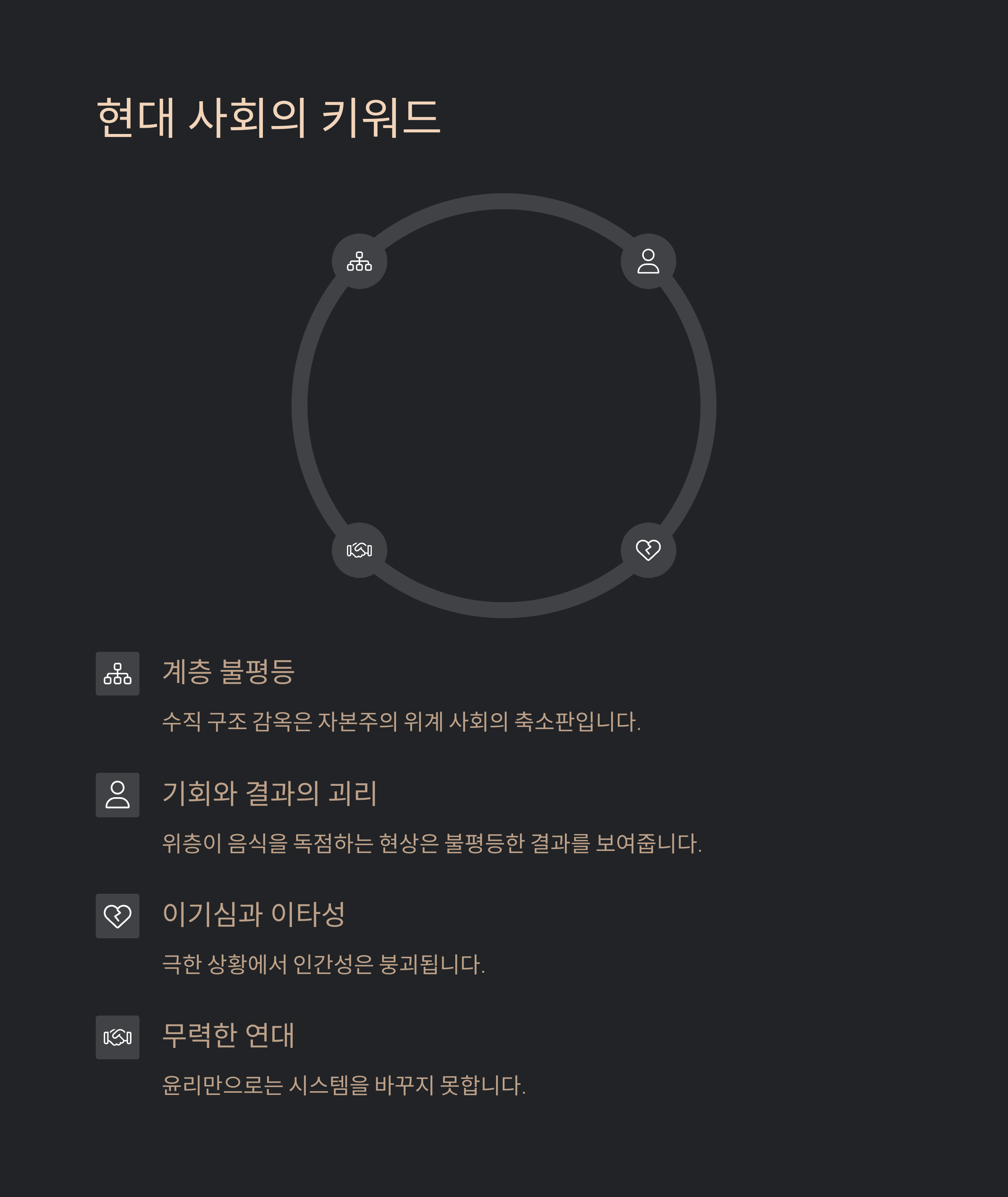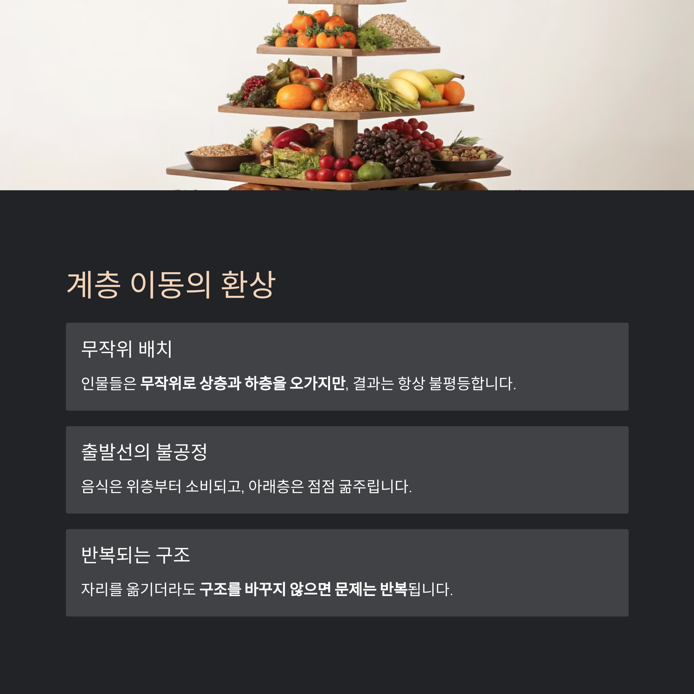 | 기회와 결과의 괴리 | 위층이 음식 독점 | 출발선은 같지만 결과는 다르다 |