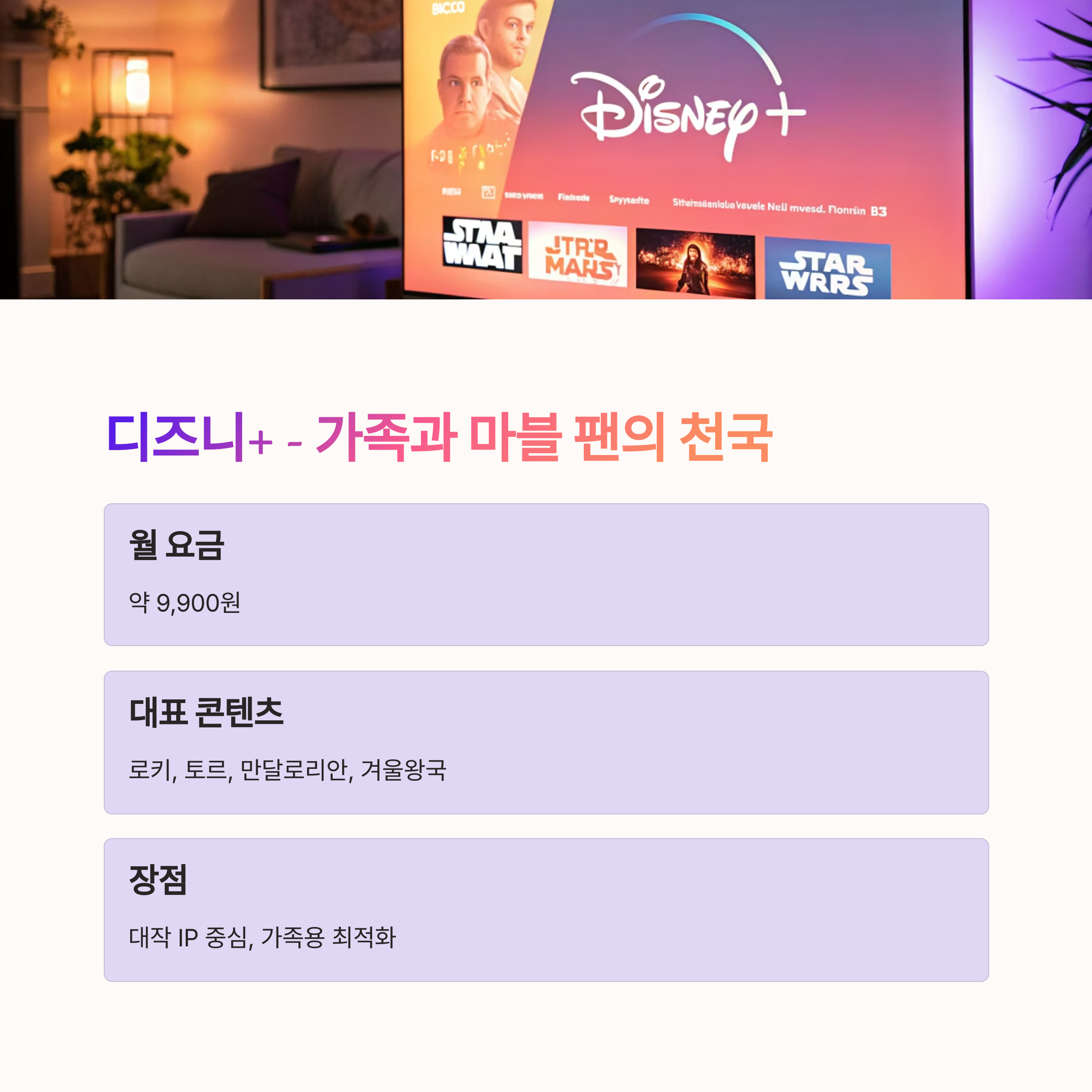 | 디즈니+ | 가족, 마블/픽사 팬 | 대형 IP, 고퀄 애니메이션 |