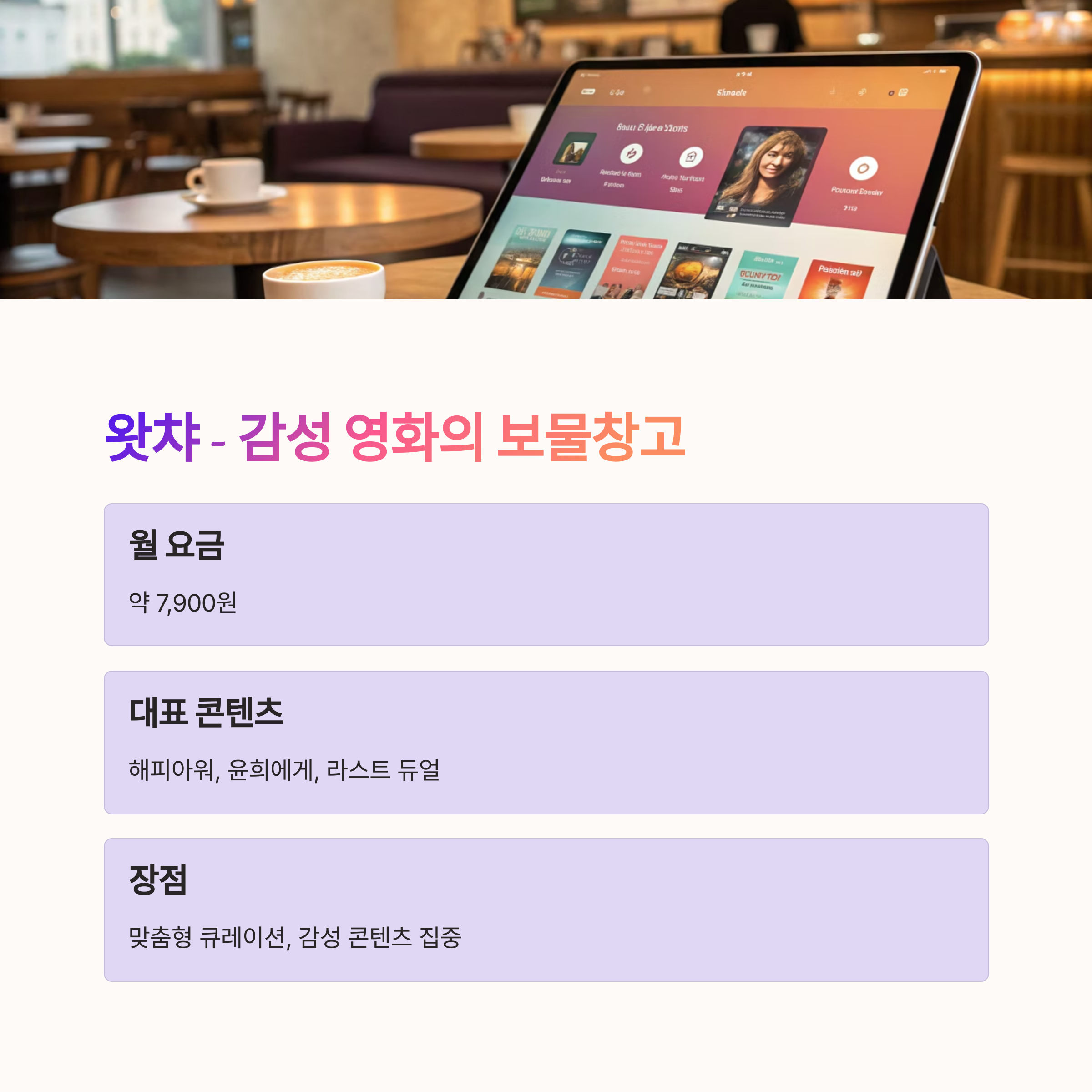 | 왓챠 | 감성 영화, 독립영화 애호가 | 큐레이션, 예술영화 집중 |