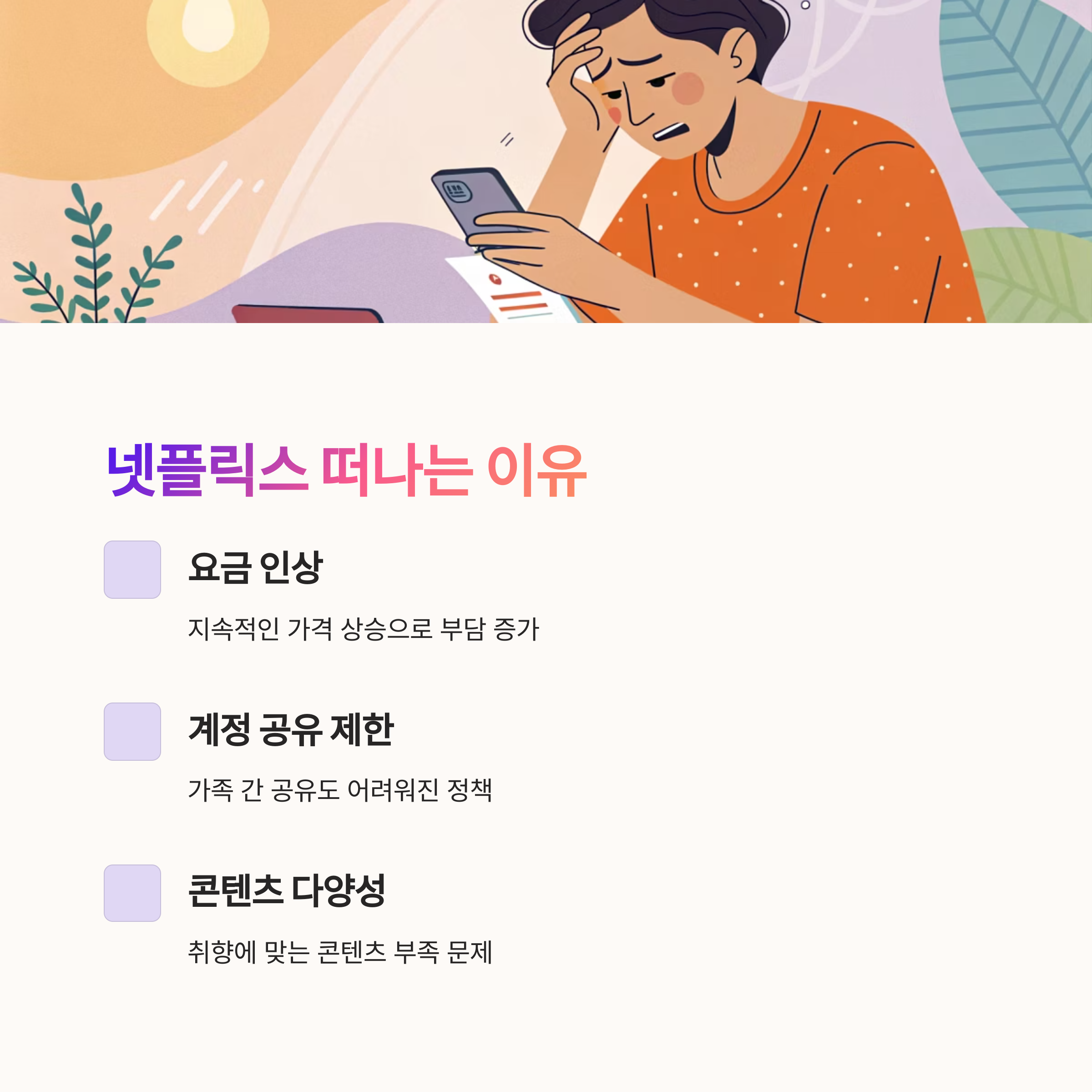 넷플릭스의 요금 인상, 계정 공유 제한, 콘텐츠 다양성 문제 등으로