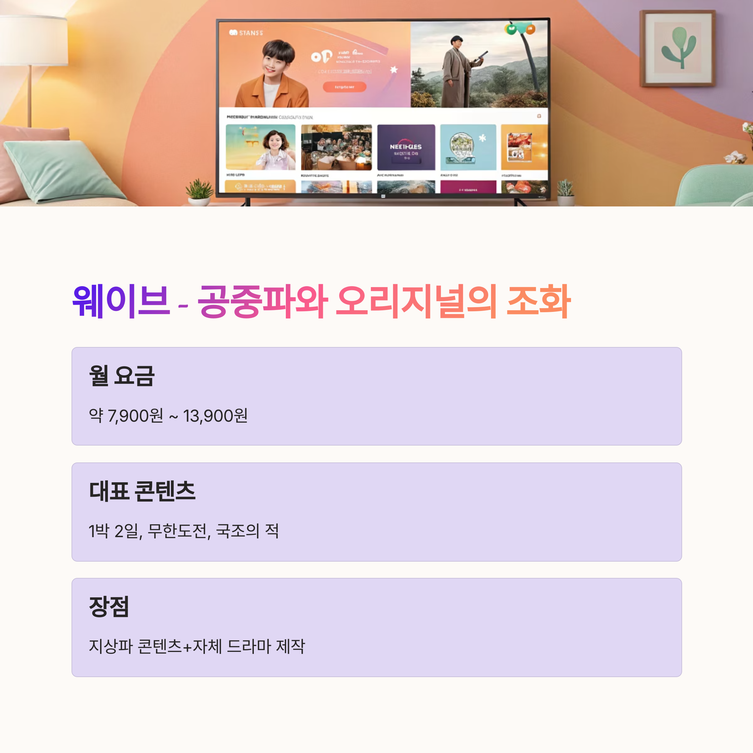 | 웨이브 | 공중파 콘텐츠 중심, 중장년층 | 방송3사 콘텐츠+뉴스 제공 |