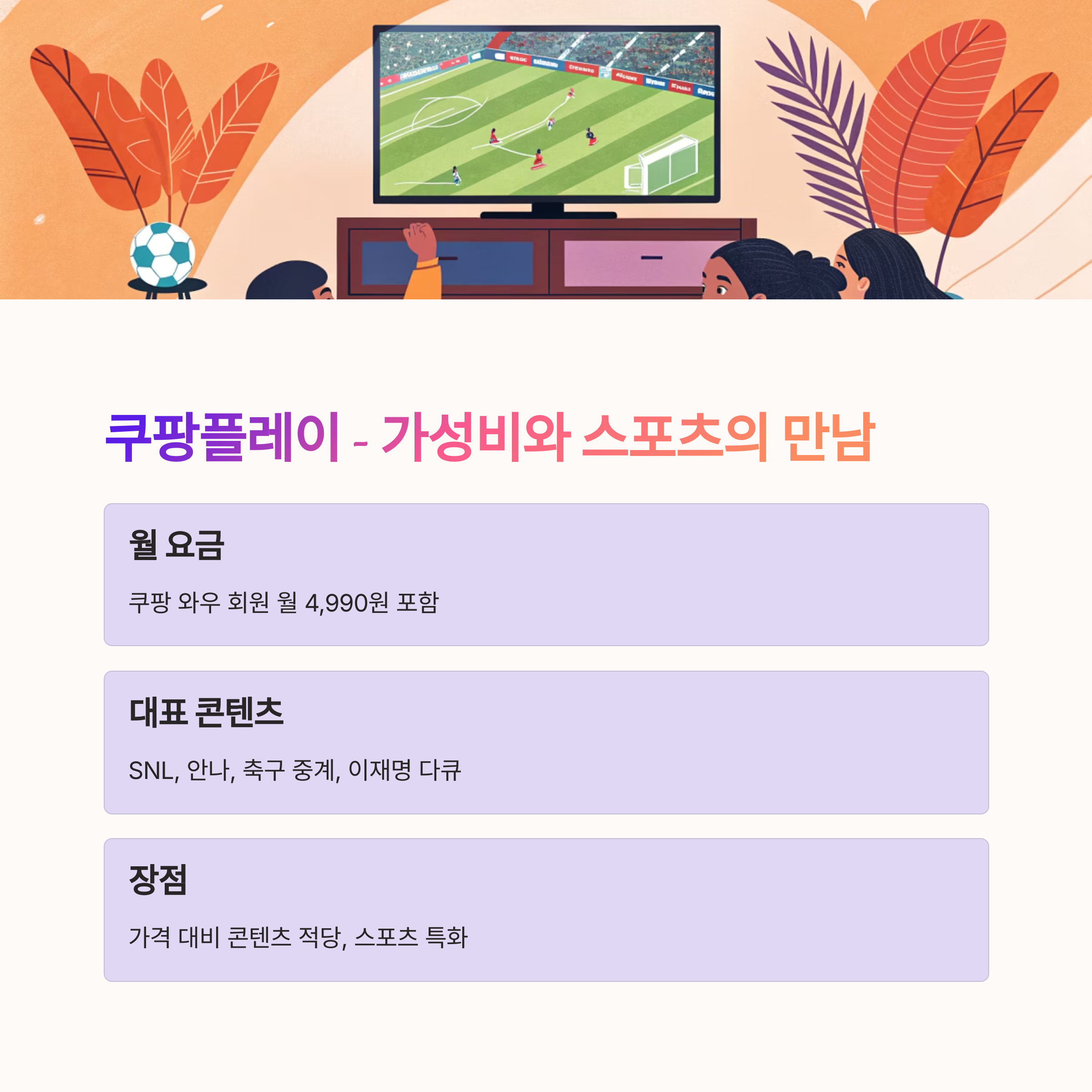 | 쿠팡플레이 | 가성비 중시, 스포츠 팬 | 축구 중계, 와우회원 무료 |