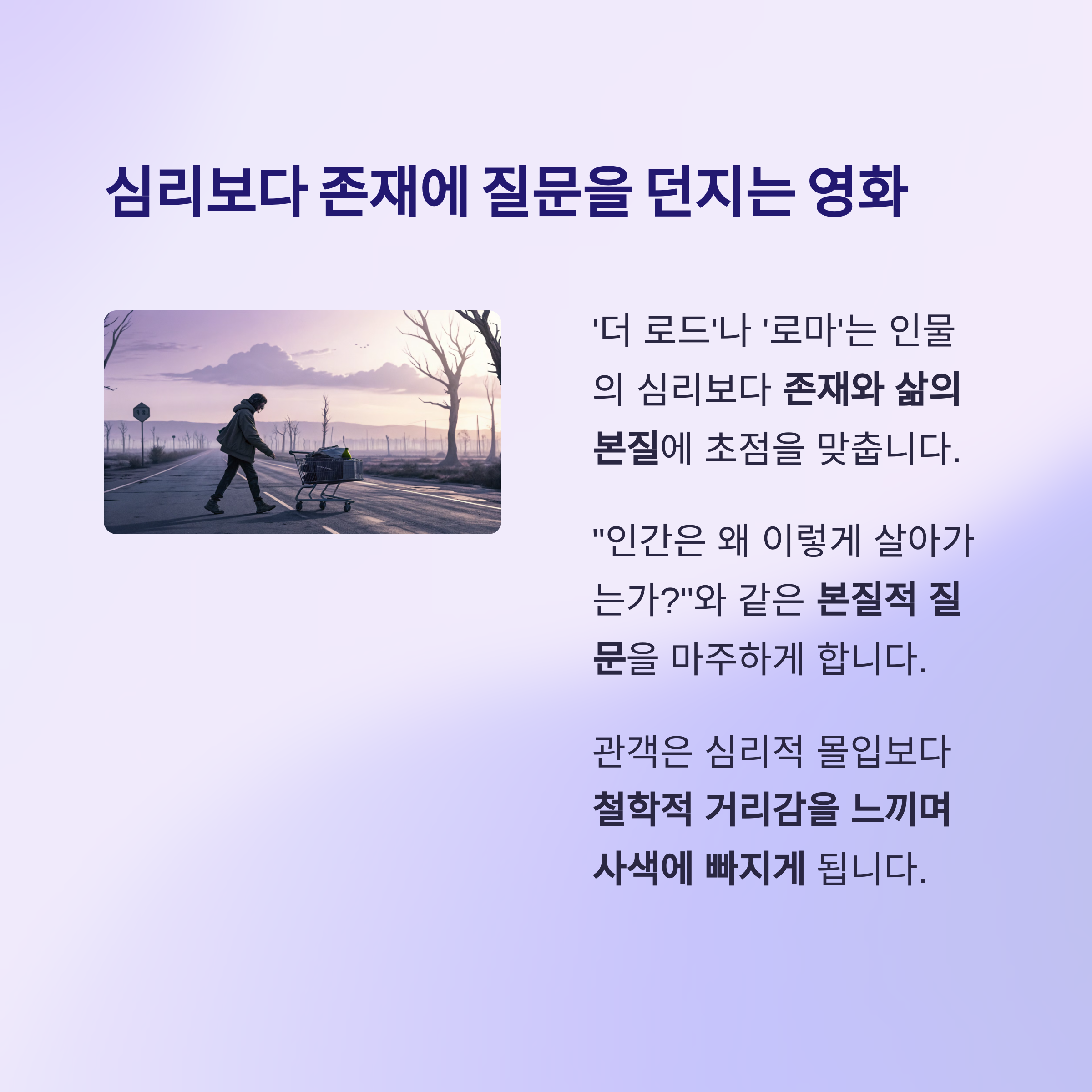 철학적 영화는 인물의 심리 묘사보다 존재와 삶의 본질에 초점을 맞춥니다