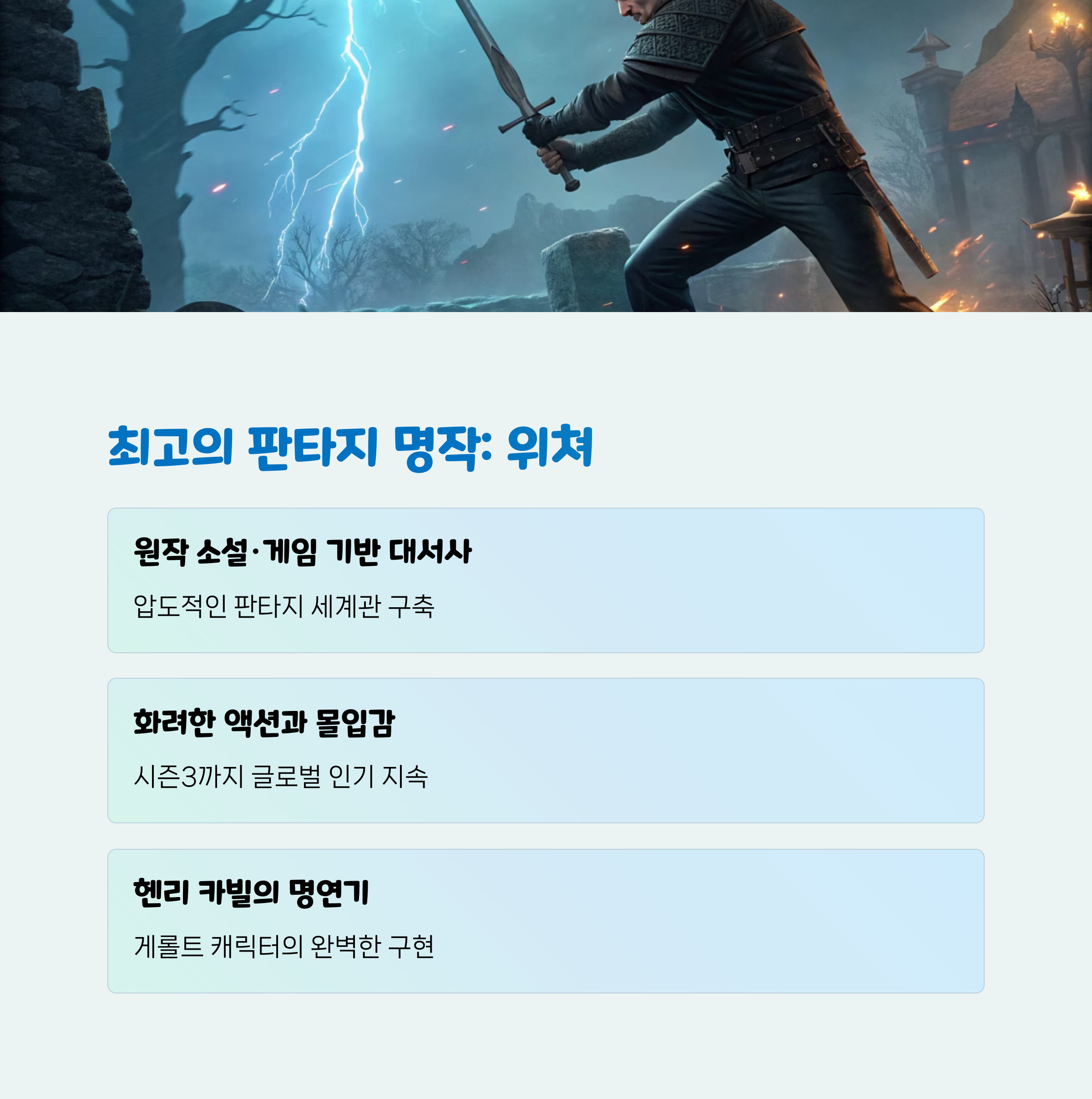'위쳐' 는 괴물을 사냥하는 운명의 사나이, 게롤트의 여정을 그린 판타지 드라마입니다