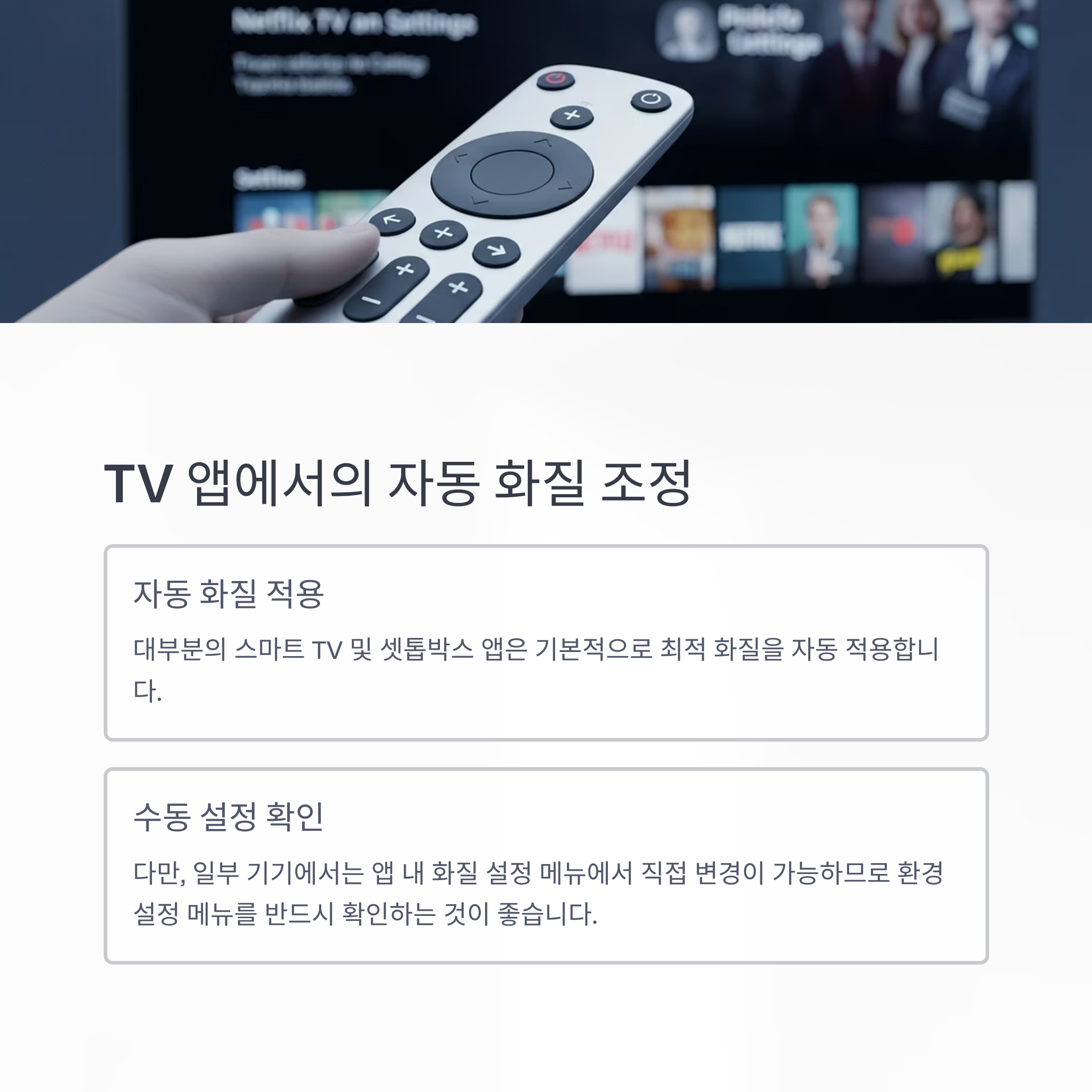 대부분의 스마트 TV 및 셋톱박스 앱은 기본적으로 최적 화질을 자동 적용합니다.